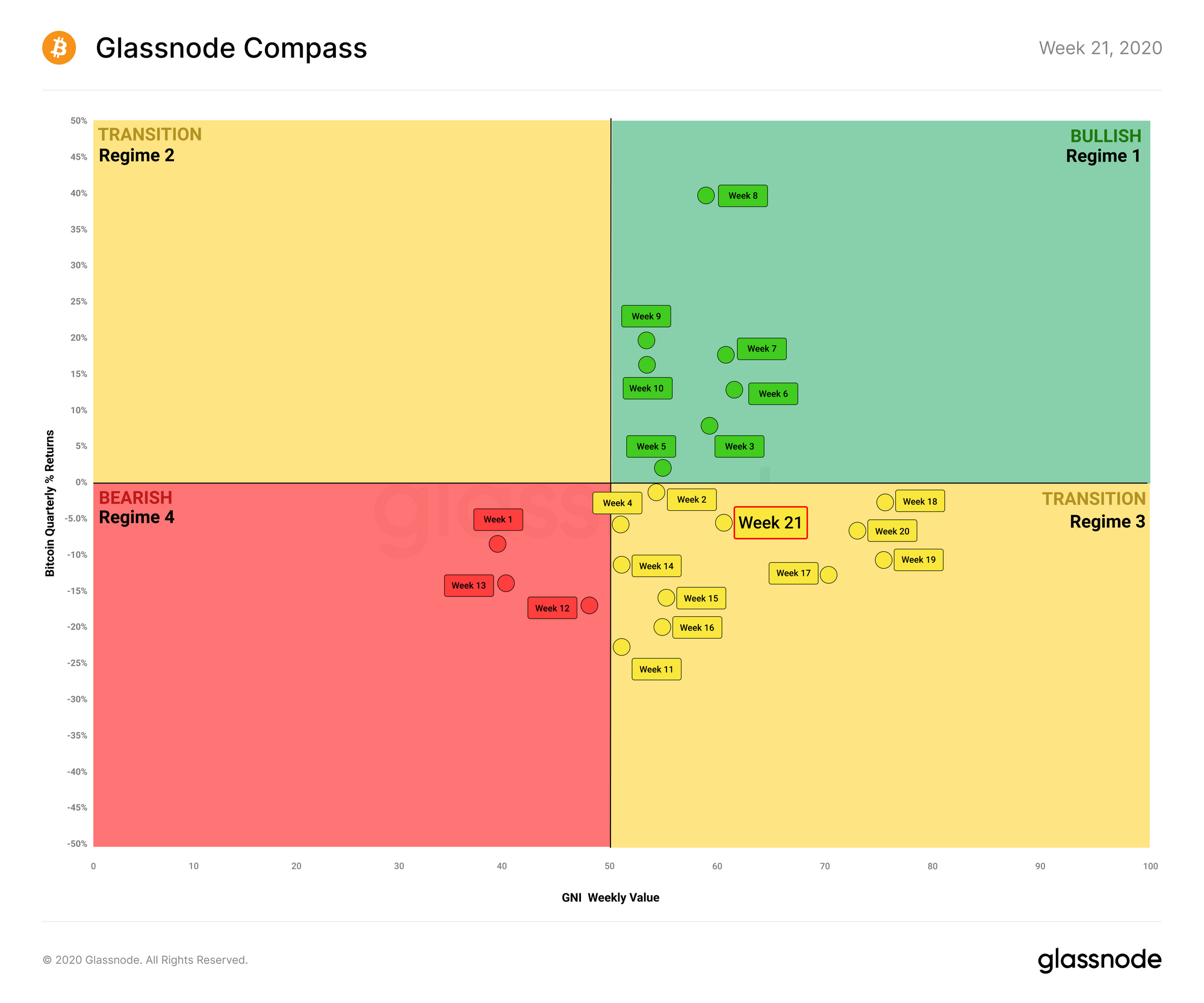 The Glassnode Compass outlines the general regime in which Bitcoin is currently located, based on its on-chain fundamentals (as determined by the GNI) and its recent price behavior.