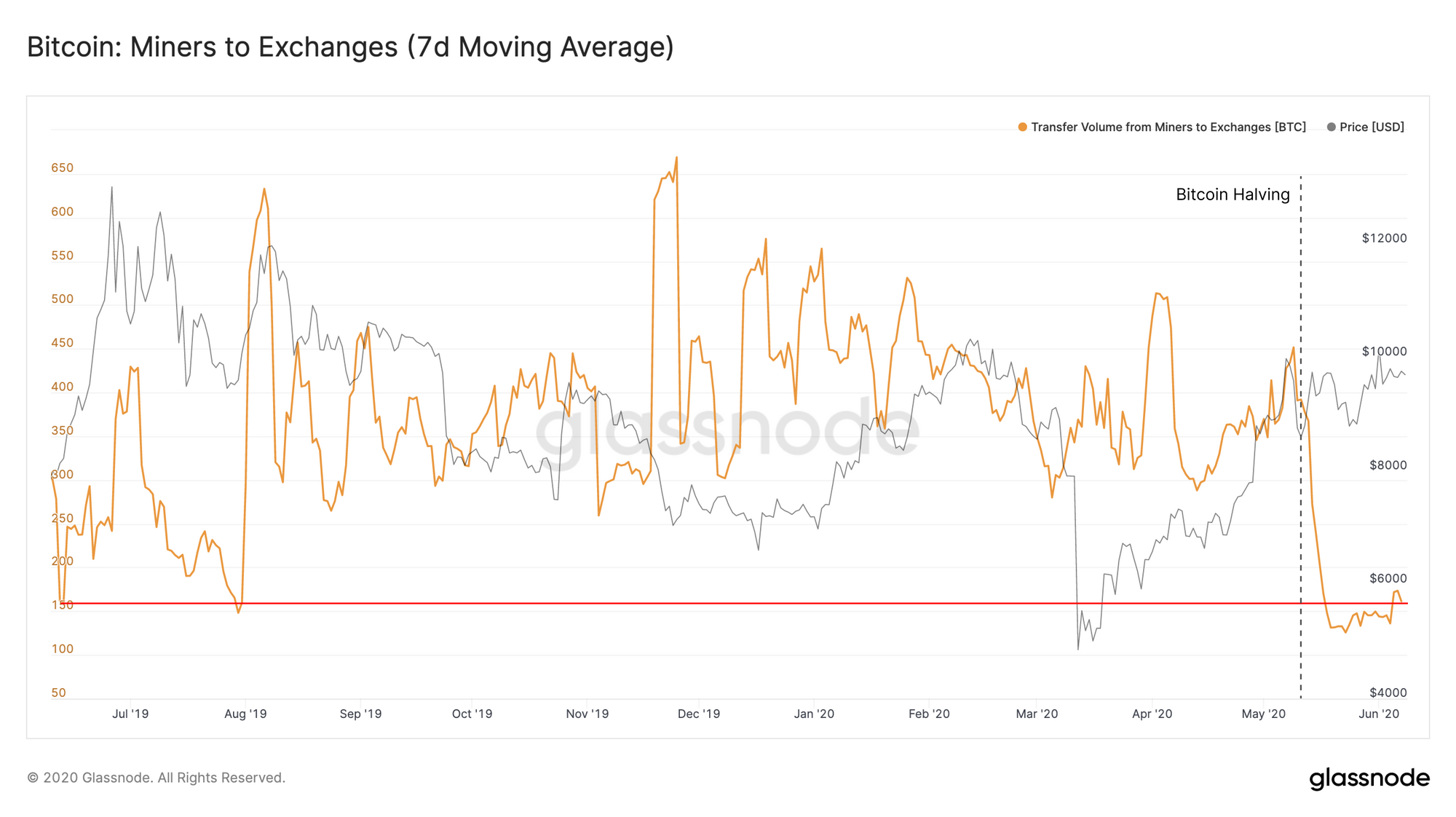 Logic dictates that the flow of BTC from miners to exchanges should drop by around 50% after a halving event, as BTC-denominated revenue drops by almost this amount (slightly less, due to fees staying consistent or even increasing). However, the number of BTC being sold by miners dropped by more like 65%, suggesting that miners are withholding their profits until the price increases.