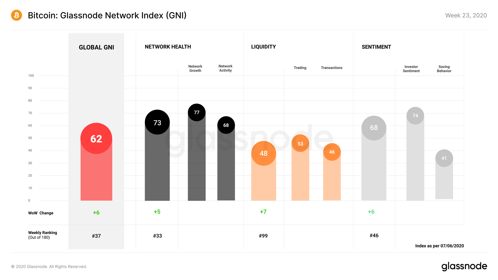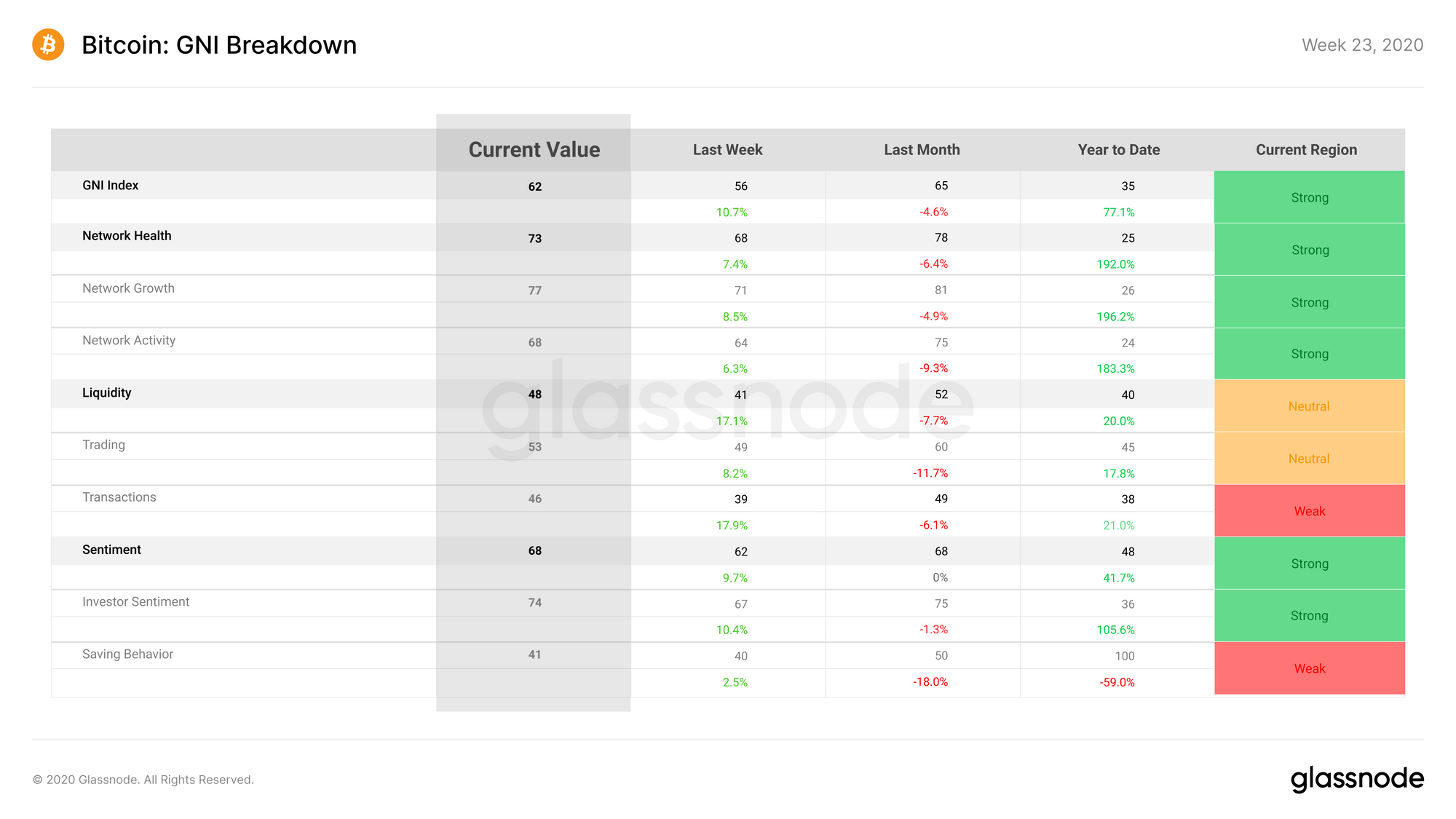 Meanwhile, Bitcoin on-chain fundamentals began to recover during Week 23. After several weeks of trending downward, GNI increased by 6 points, placing it back in the strong zone at 62 points. This was driven by an overall improvement in fundamentals, which saw all GNI sub-indices and their sub-categories experiencing an uptick last week.