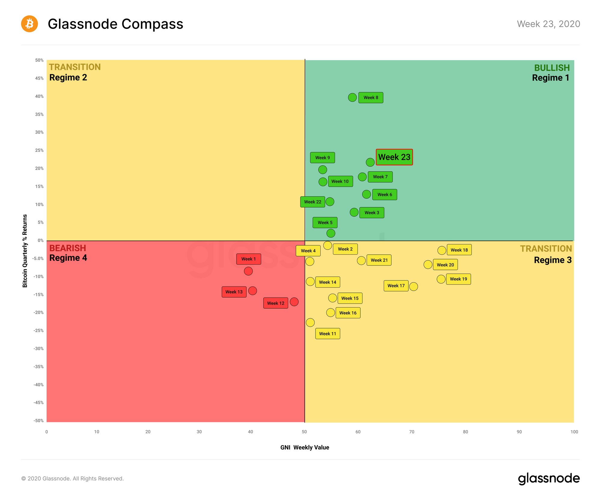 The Glassnode Compass outlines the general regime in which Bitcoin is currently located, based on its on-chain fundamentals (as determined by the GNI) and its recent price behavior.