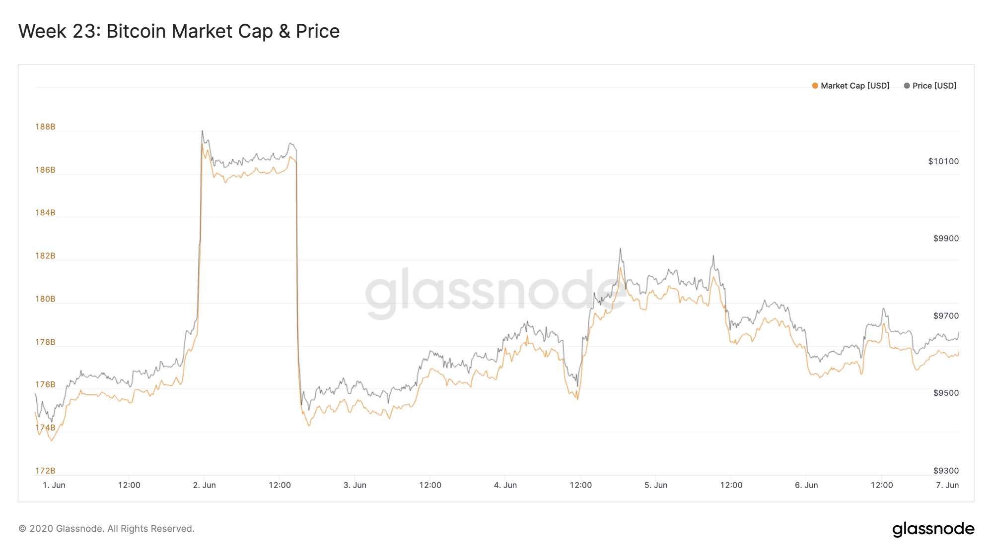 Bitcoin's price increased slightly over Week 23. Prices mostly fluctuated between $9500 and $9800, but BTC experienced a classic "Bart Simpson" pattern on Tuesday, spiking up to above $10,100 for around 15 hours before returning to the mid-9000s.