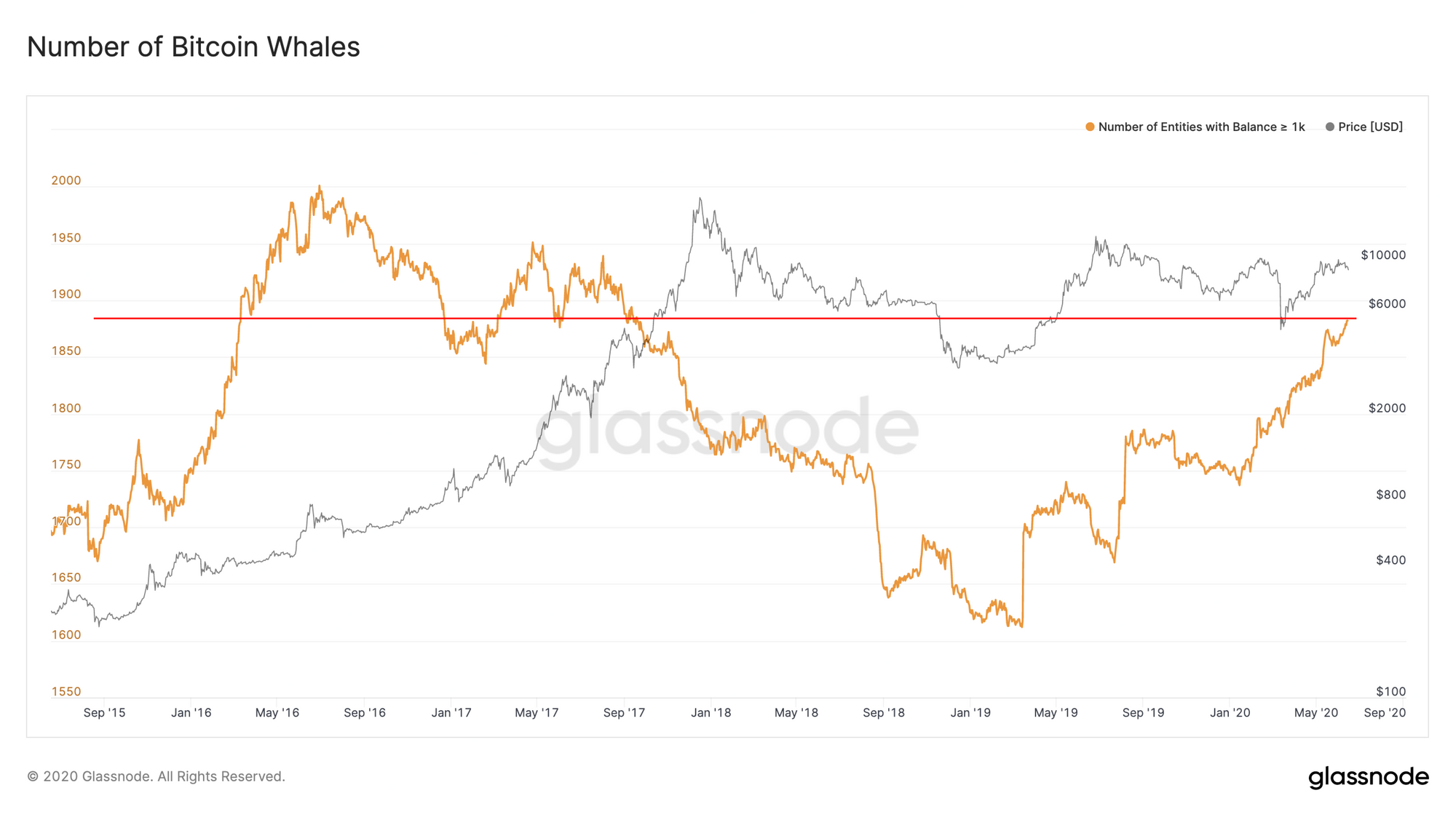 Despite the volatile market movements of 2020, the number of bitcoin whales has been growing near-consistently since January, with a current value of 1882 entities holding at least 1000 BTC.