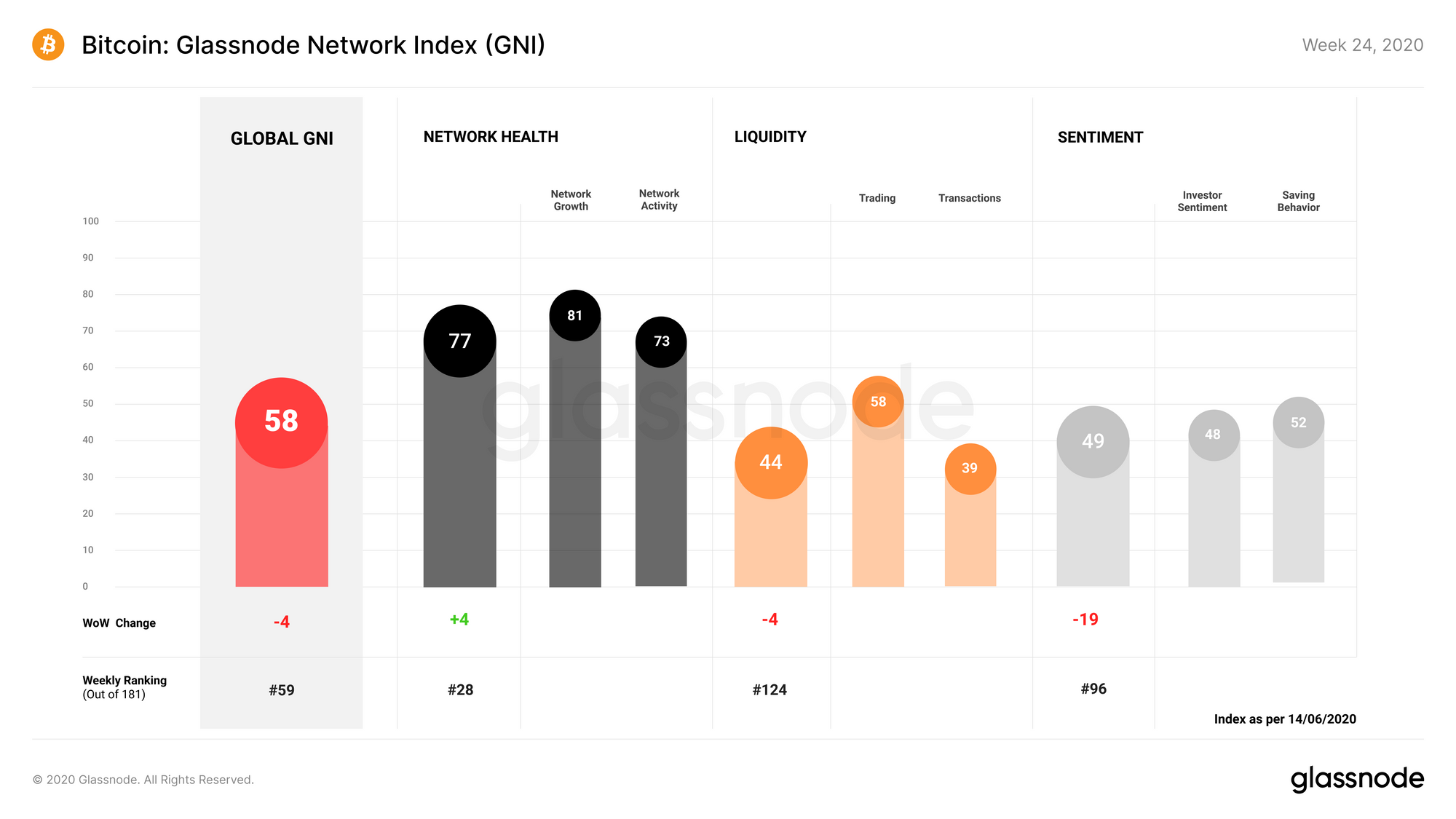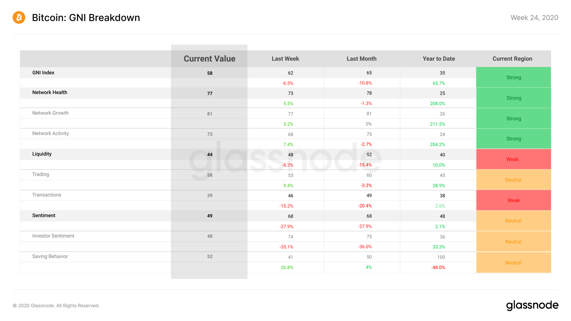 After growing for 2 weeks, Bitcoin on-chain fundamentals dropped during Week 24. GNI lost 4 points, dropping down to 58 points as market sentiment decreased along with bitcoin's price, but this was mitigated by increased network activity and growth.