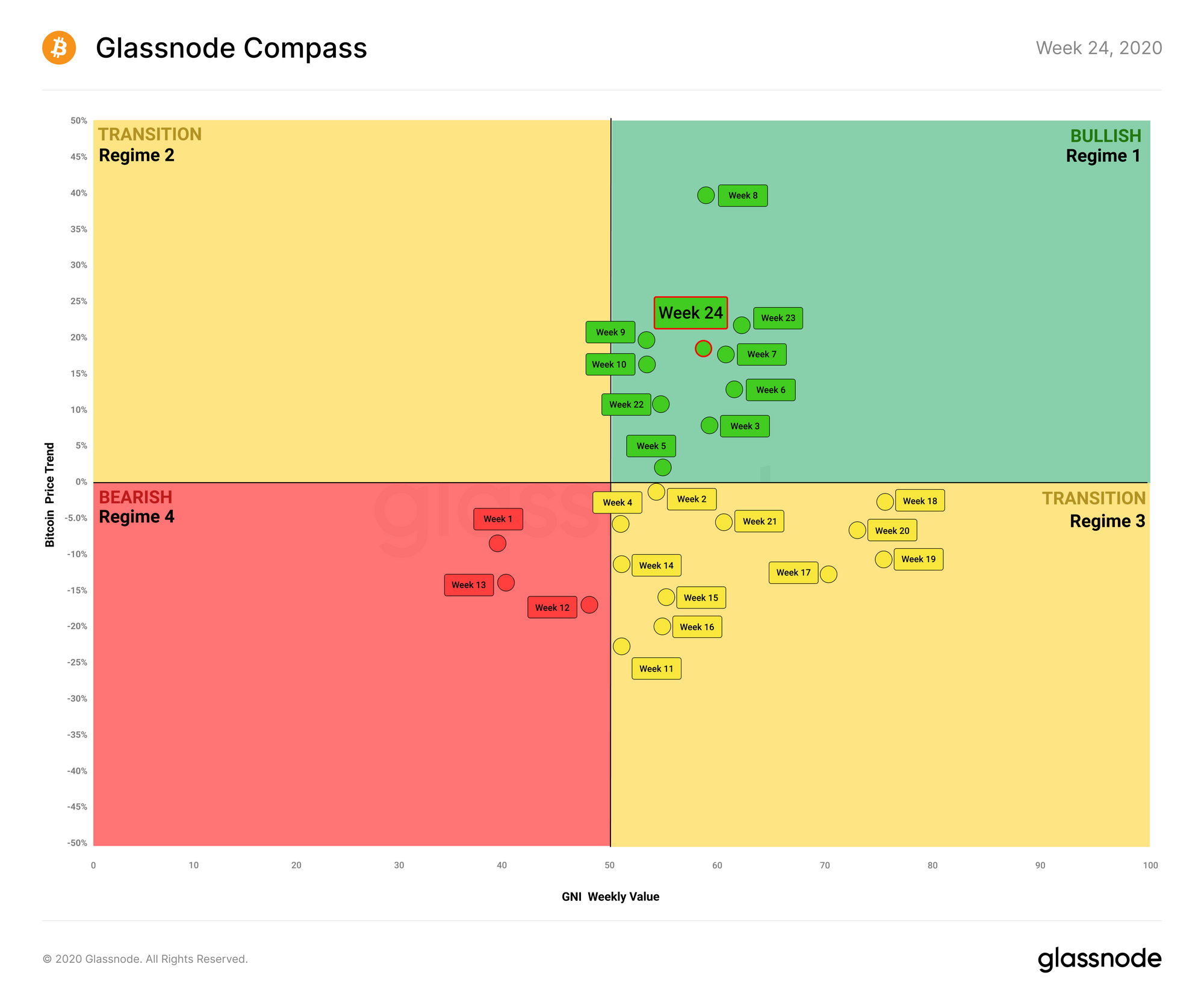 The Glassnode Compass outlines the general regime in which Bitcoin is currently located, based on its on-chain fundamentals (as determined by the GNI) and its recent price behavior.