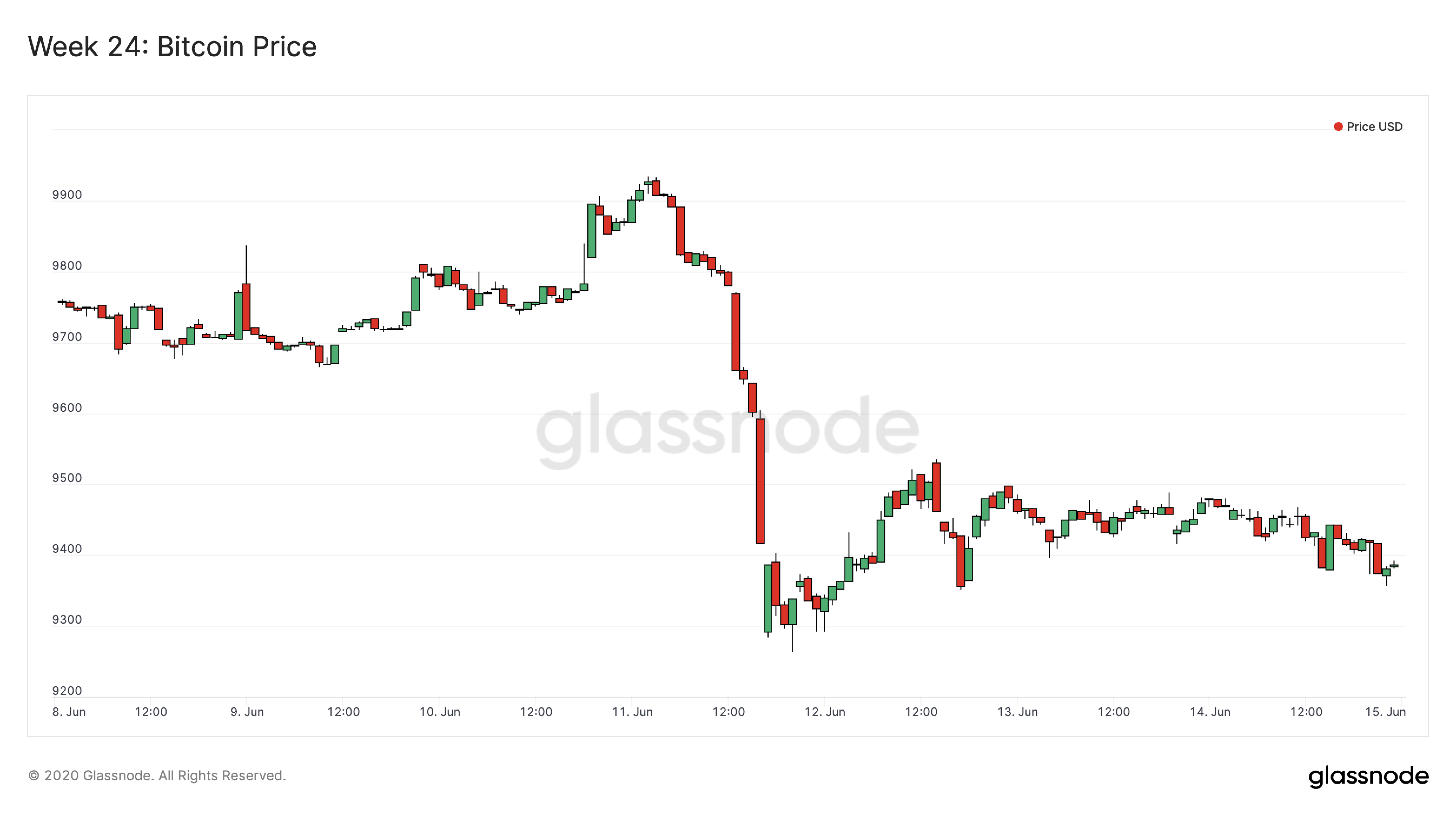 Bitcoin saw a ~4% drop over Week 24, starting off at around $9750 before dropping significantly on Thursday and ending the week at $9380.