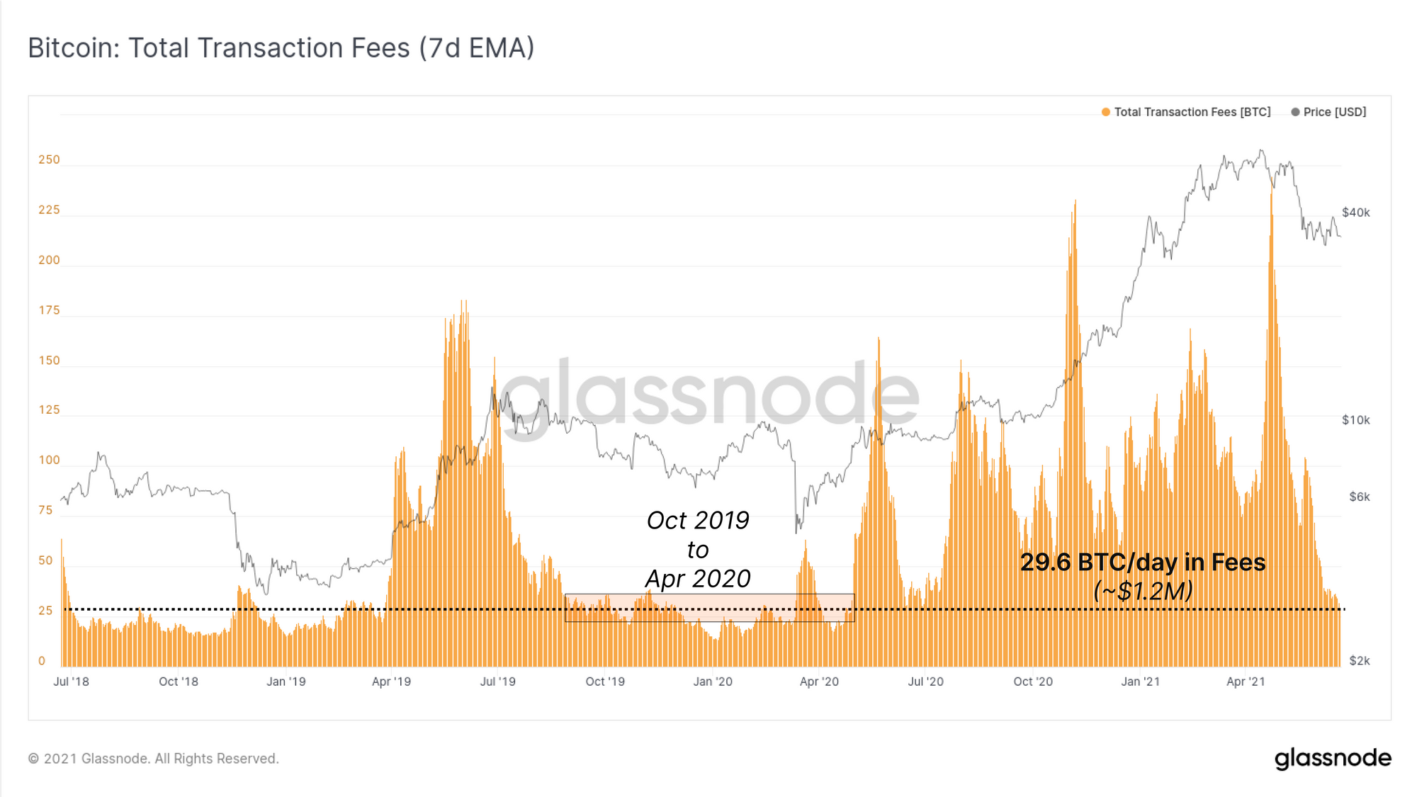 Naturally, the priority fees for inclusion in the next block have fallen significantly as network congestion almost completely clears. Bitcoin total fees paid have fallen to just under 30BTC/day (~$1.2M), coincident with levels in late 2019 and early 2020. This currently represents around 4% of miner revenue with the block-subsidy making up the remaining 96%.