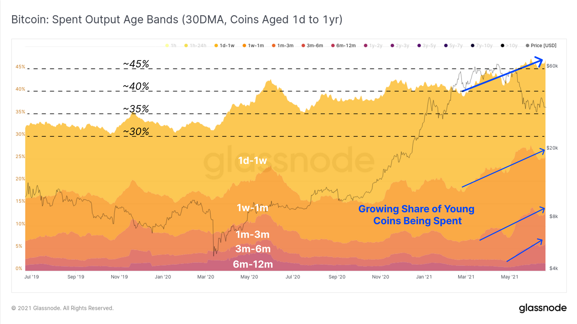 If we investigate aggregate spending behaviour over the last year, we see the proportion of young coins (those < 1yr old, excl. < 1day) on the move has continued to increase as a proportion of transaction flow. In the last few months, we see younger coins accounting for over 45% of the total transaction count. This is most likely a result of newer market entrants: