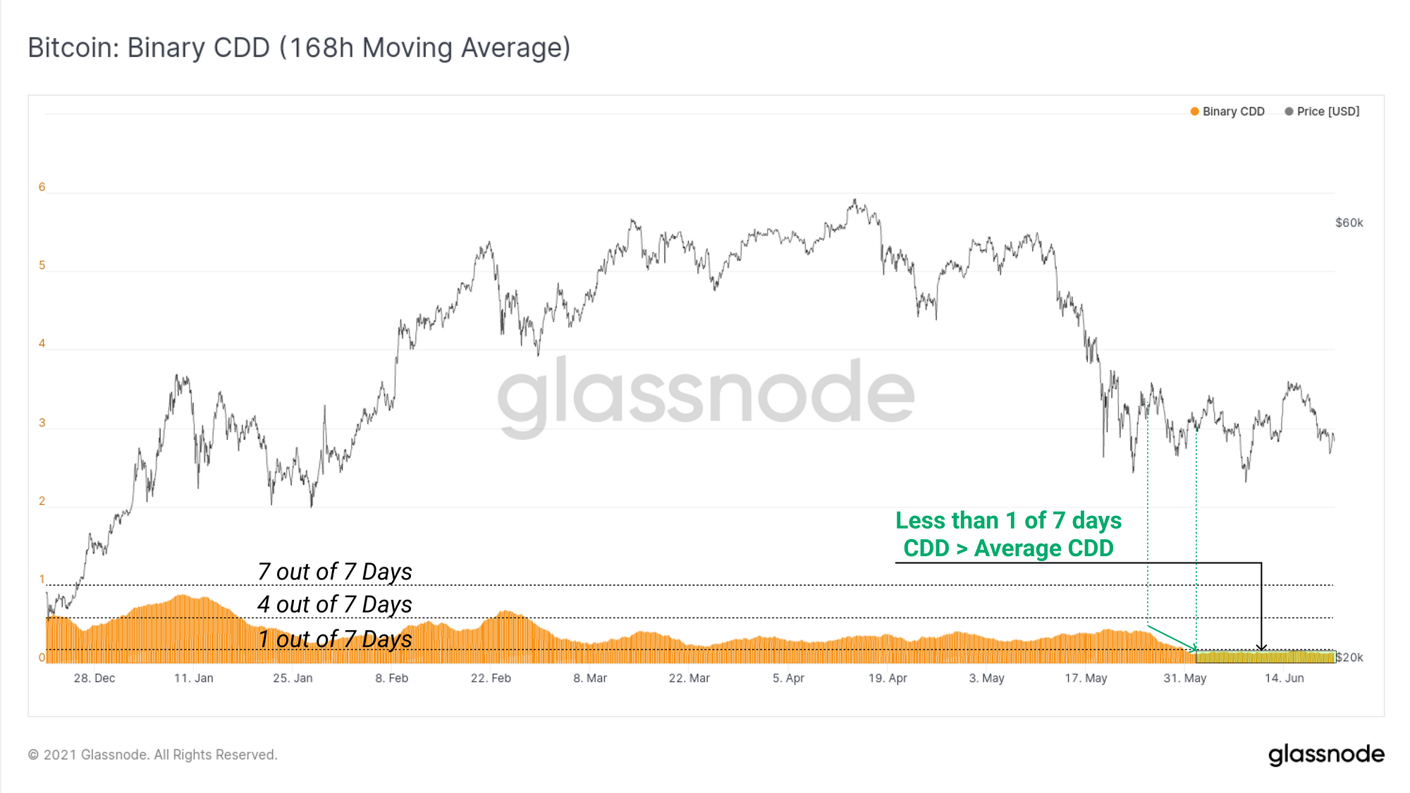 To confirm just how insignificant the spending behaviour of all coins is, we can look to the Binary CDD metric with a 7-day moving average applied. This metric will trend higher when the volume of coin-days destroyed is larger than the long term average. More coin-days are destroyed when older coins and/or large BTC size are moved on-chain.