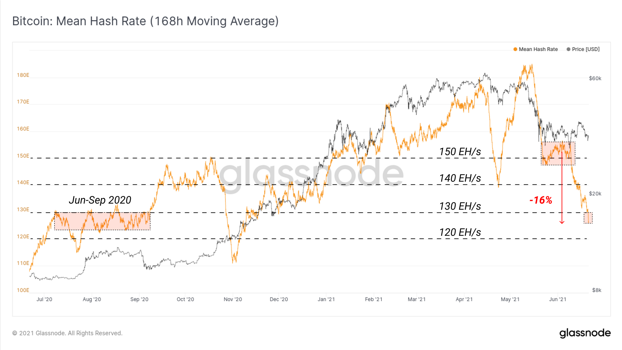 Over the past two weeks, the estimated mean hash-rate (7DMA) has declined by around 16%, falling from approximately 155 EH/s to around 125 EH/s. Hash-power has now returned to levels that were sustained throughout mid 2020.