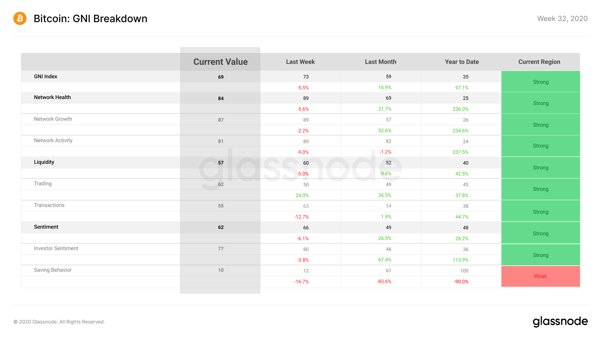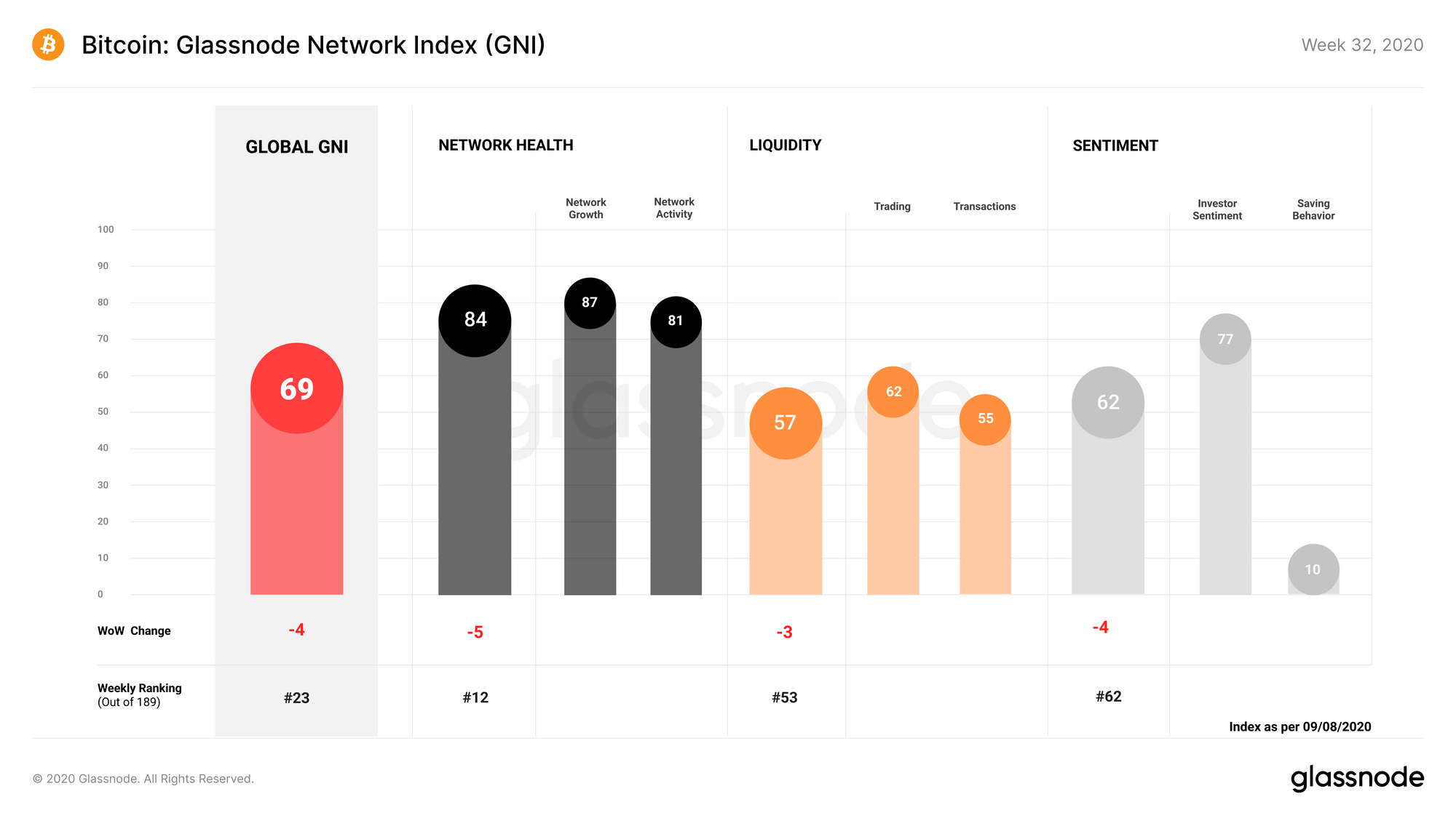 Bitcoin on-chain fundamentals decreased slightly throughout Week 32, with GNI slipping down to 69 points from 73 the previous week. This drop was due to slight decreases in on-chain fundamentals across all subindices - but overall on-chain health remains intact.