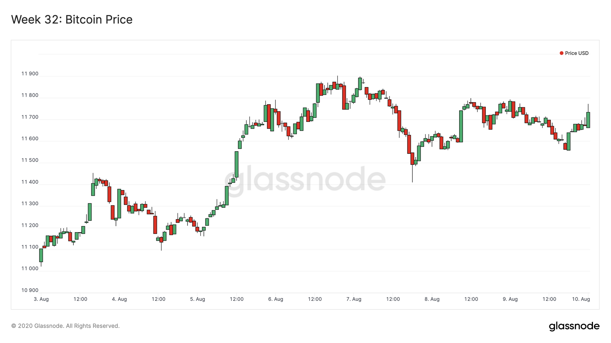 Bitcoin had another high-performing week, starting out Week 32 at around $11,100 and ending the week at $11,650. As of Monday morning, it has spiked up even further, and is currently hovering slightly below $12,000.