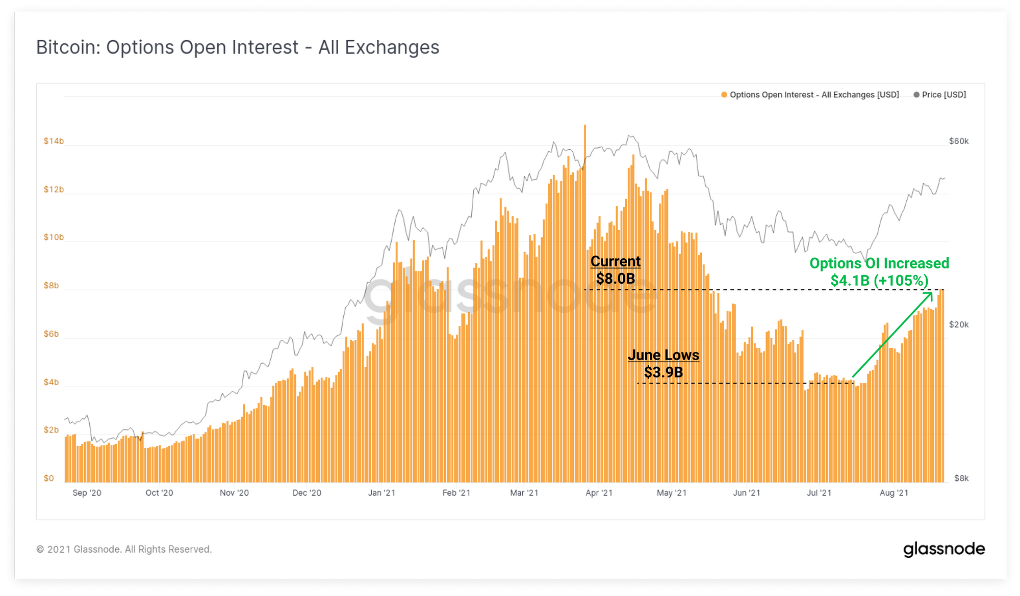 In derivatives markets, open interest for both Futures and Options has climbed alongside price to reach new local highs. After the precipitous fall from the $27.4B ATH during the May sell-off, open interest in Bitcoin futures markets has risen by $6B (+56%) from the lows of the recent consolidation. This week in particular, saw an increase of $1B in futures contracts opened as traders begin to take on more leverage.