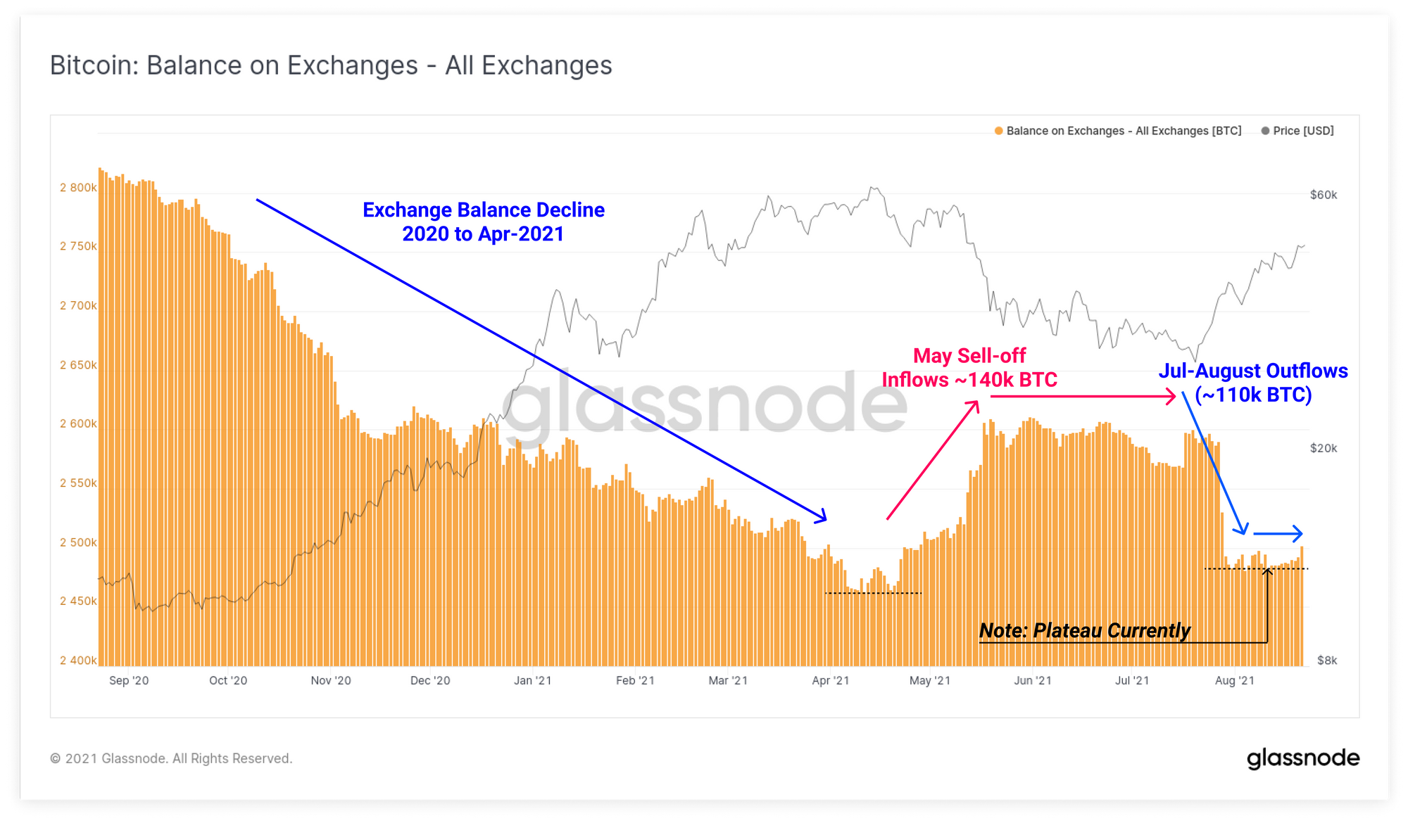 After the significant net inflow of around 140k BTC to exchanges in May, July saw around 110k BTC in net outflows, largely reversing that trend. However throughout August, exchange balances have stalled at around 2.5M BTC (~13% of circulating supply).