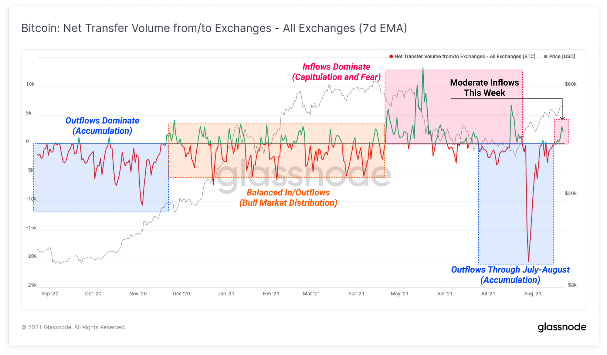 The Exchange Net Flow metric shows that this week saw overall net inflows to exchanges as some traders and investors appear to be taking profits, and capitalising on market strength. It is worth noting that the magnitude of inflow is not dissimilar to that seen through the Dec 2020 to April 2021 bull market period and is reasonably expected behaviour.