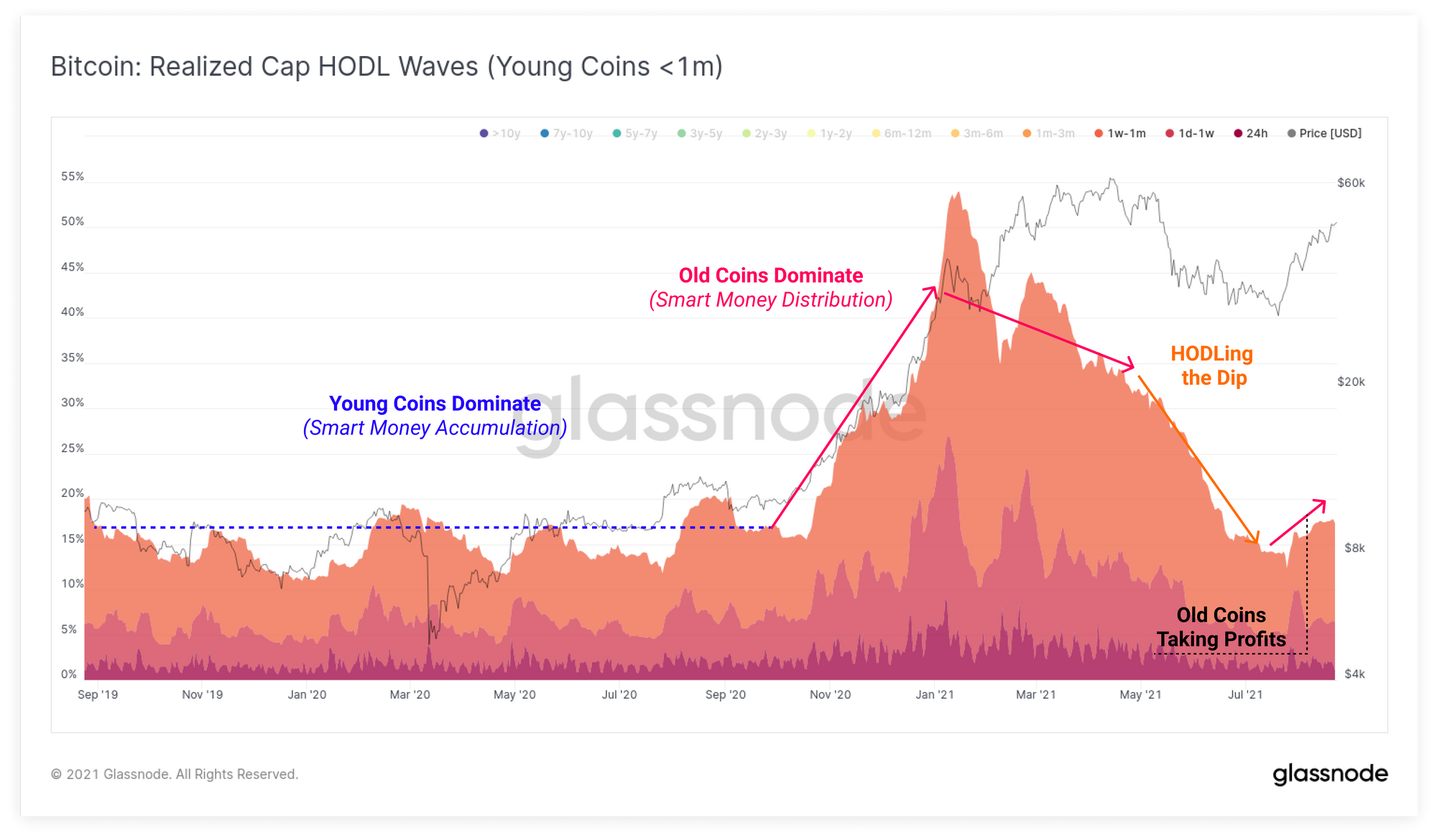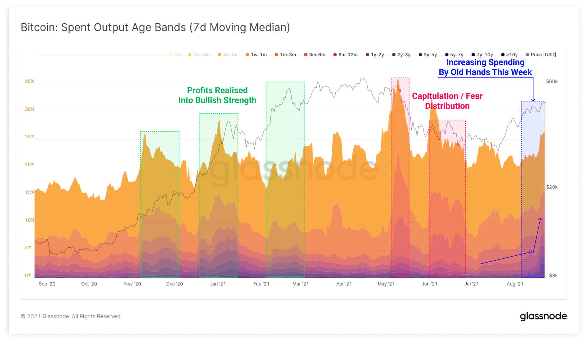 The Realised Cap HODL waves provide a last piece of evidence surrounding the current on-chain spending behaviour, as the young coin bands (< 1 month old) have swelled throughout August. This indicates that older coins have been spent and revalued into younger coin age brackets.