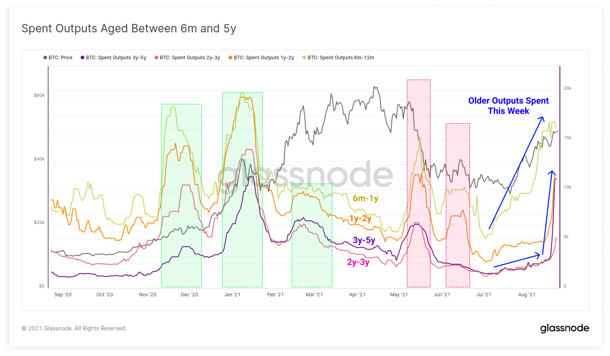 If we investigate the Spent Output Age Bands metric, we can start to dissect which cohorts of the market are spending coins. This week has seen a noticeable uptick in older coin ages, particularly those older than 6-months. In the last year, these older coins have come back to life on a similar scale in two instances: