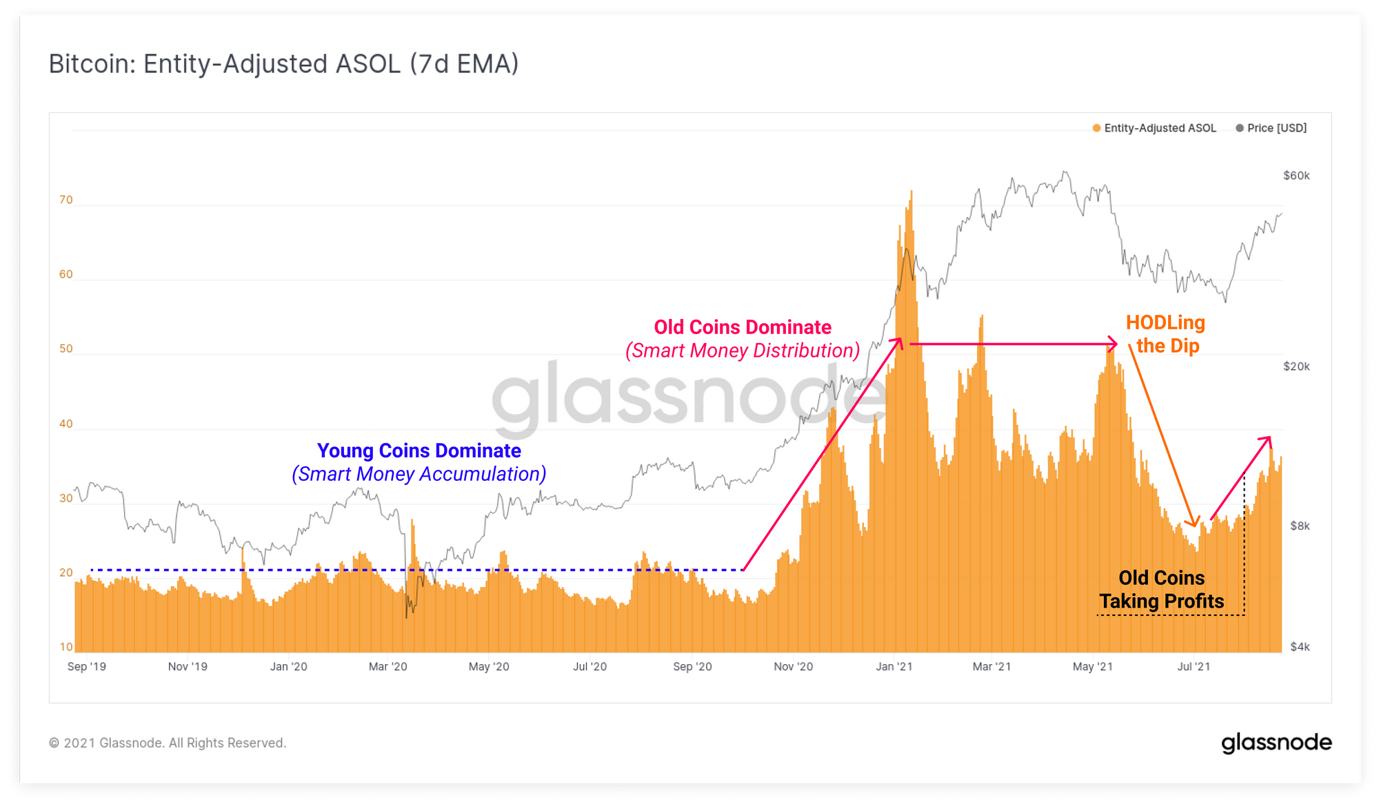 The spending of older coins has also shown up as a trend in the ASOL metric which measures the average age of all spent outputs that day. This trend of rising average age has been in play since July and throughout this rally which suggests two things: