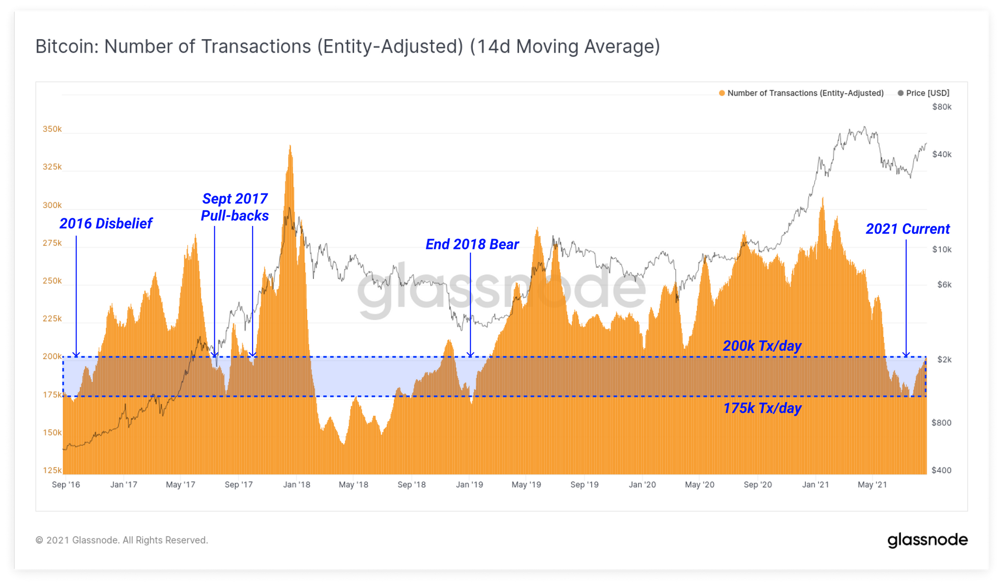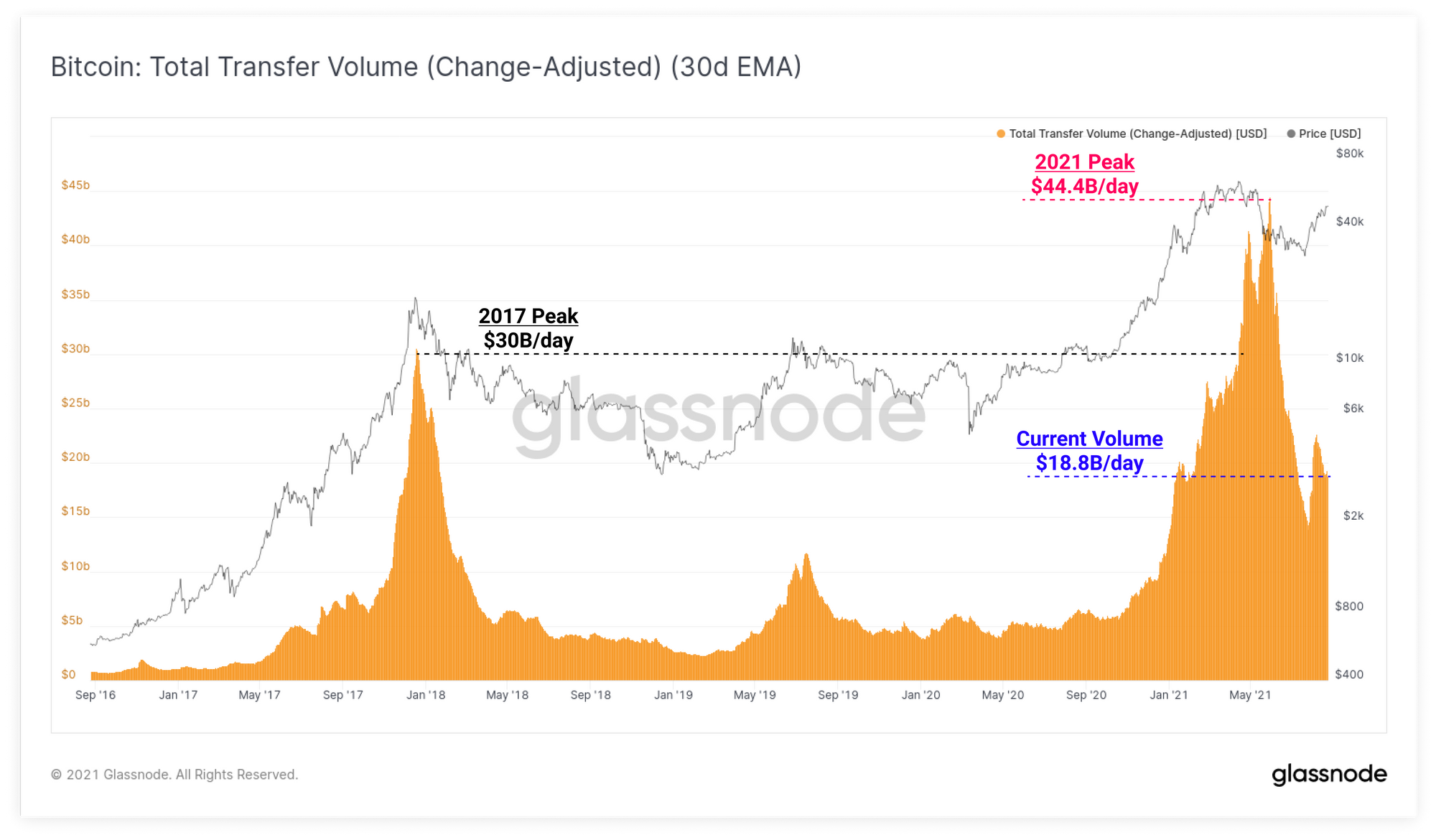 Transaction volumes are similarly depressed, with the Bitcoin network setting around $18.8B in daily volume. This is 37% lower than at the 2017 bubble peak, and a whopping 57.6% below the peak set during the May capitulation event. That said, settlement volume remains 276% higher than the $5B that was typical throughout 2020, although we should account for fact that price has traded up from $10k to the current level approaching $50k (+500%).
