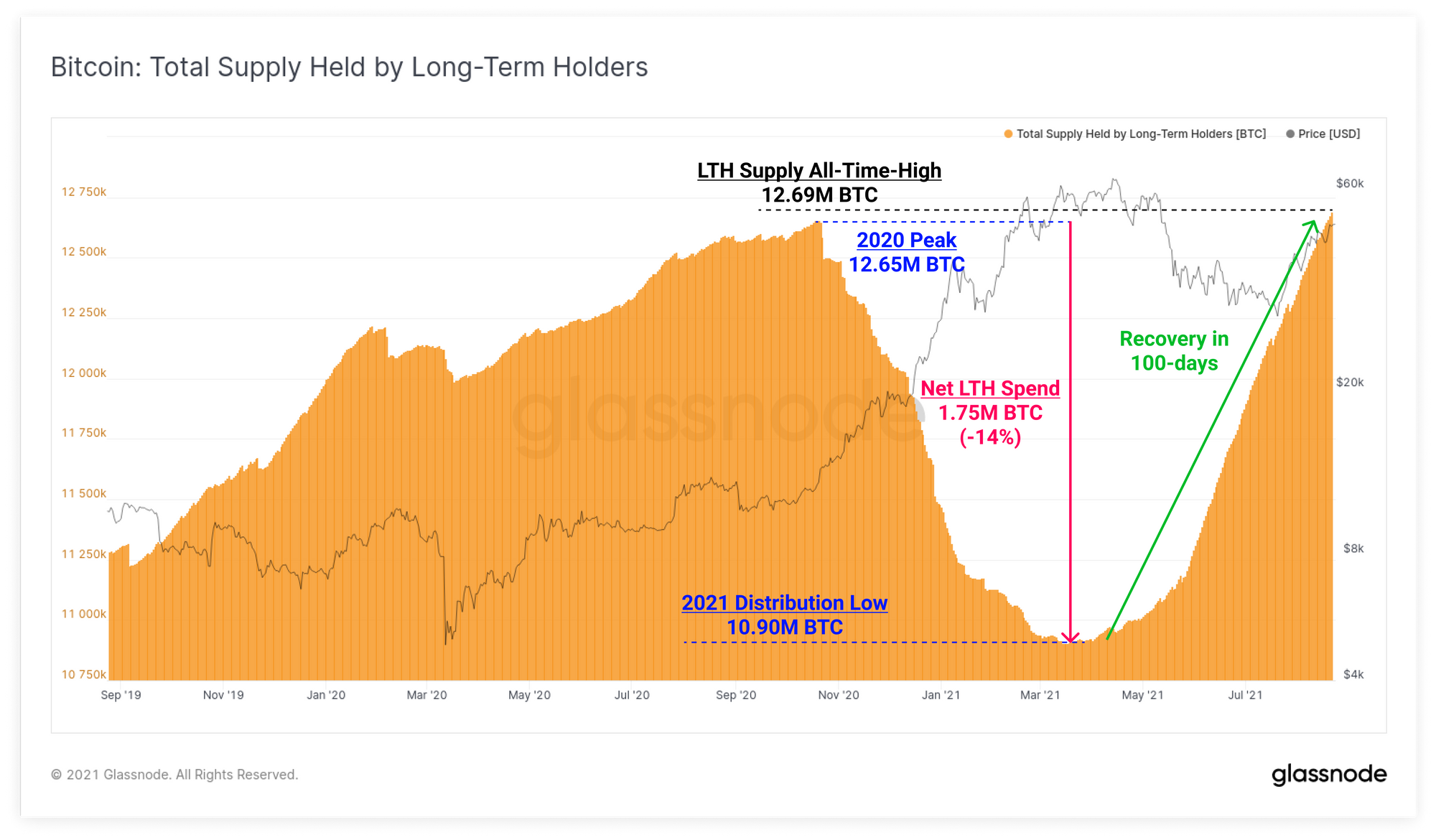 Through the Q1-Q2 bull market, LTHs distributed approximately 1.75M BTC which ultimately created oversupply, and put in the current ATH price top. Following that, investors dramatically slowed down their spending, and the coins that were accumulated in late 2020 and early 2021 have consistently matured across the ~155-day threshold for classification as 'Long-Term Holders'.