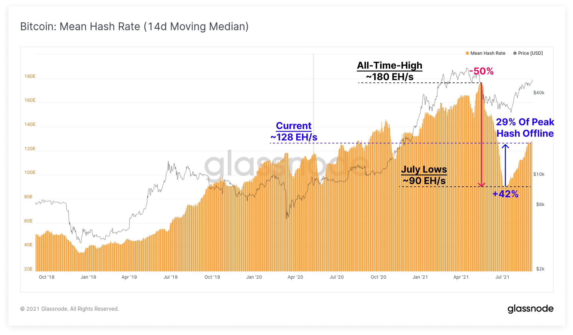 The Bitcoin mining market continues to recover after half of the hash-power came offline during the Great Migration out of China. The 14-day median hash-rate has recovered to 128 EH/s, which is approximately 29% below the all-time-high, and reflects a 42% recovery from the July lows.