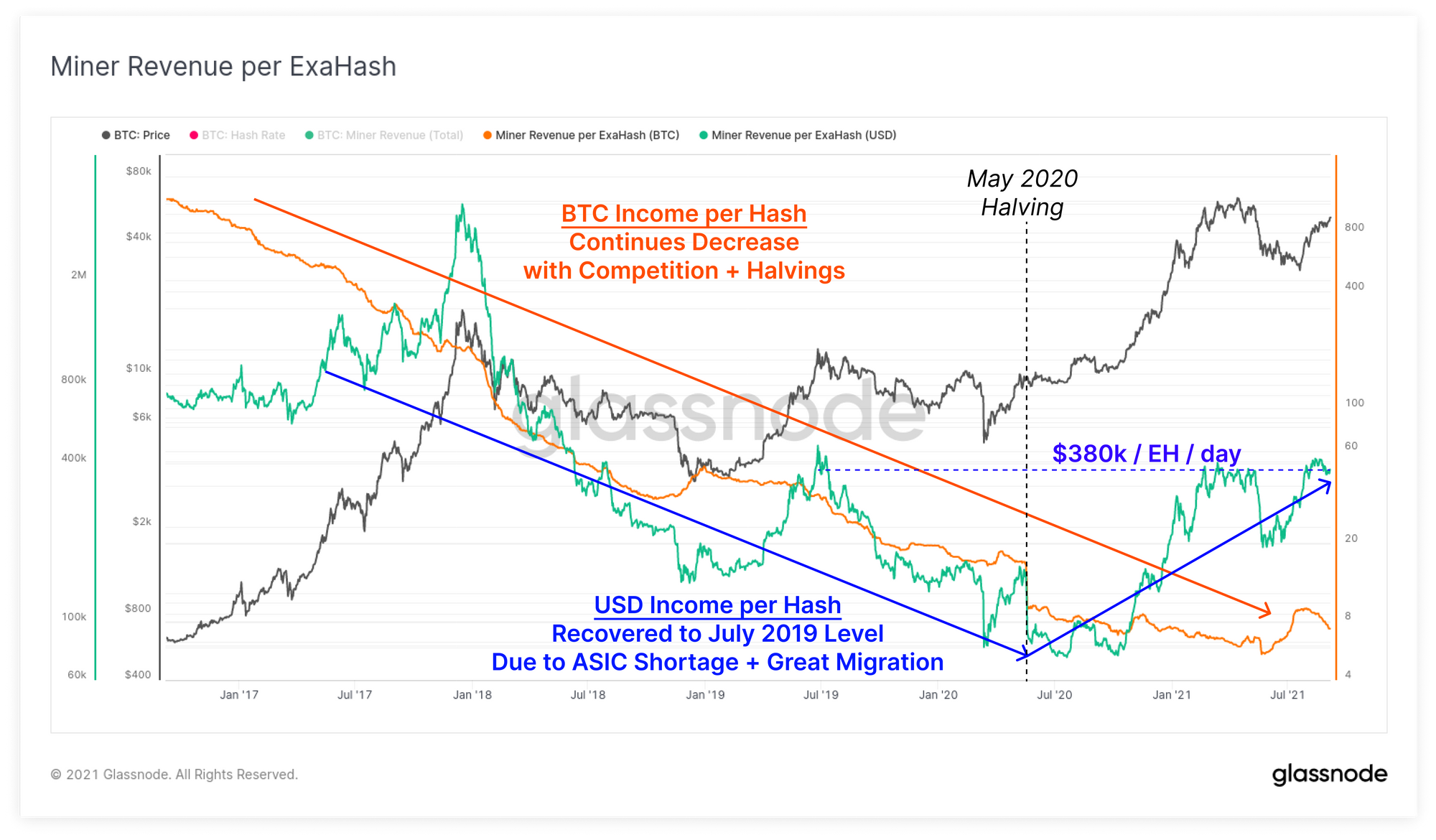 As a result, miner USD revenue per hash has now risen back to July 2019 levels of $380k per Exahash, making operational miners exceptionally profitable on a historical basis.