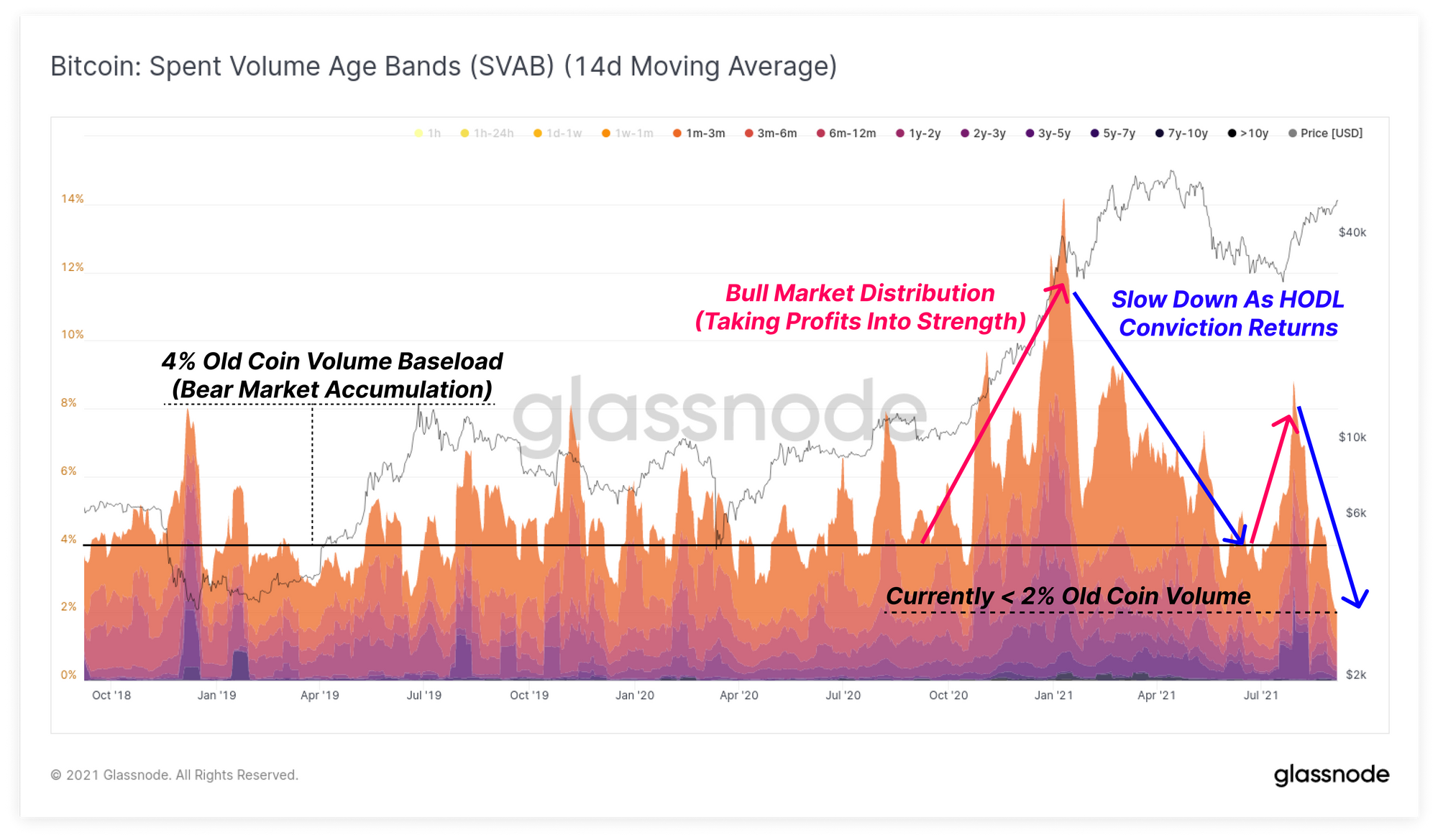 The dominance of hot coin (< 1wk) volume is currently at a relative high of 94% of spent coin volume. Simultaneously, middle and old coin (> 1mth) volume is at an extreme low of less than 2% dominance which is even lower than the bear market base-load seen in 2019-20.
