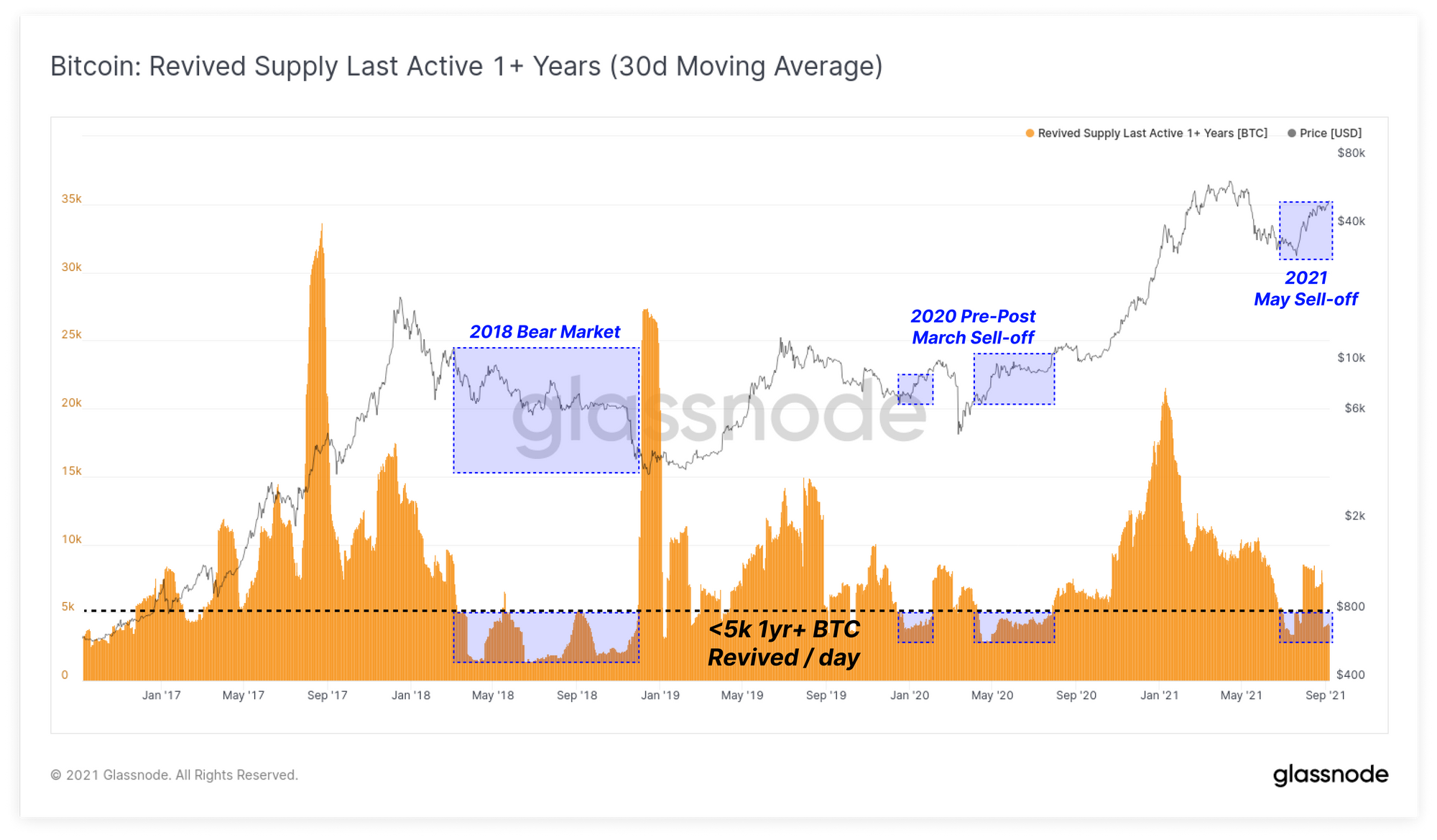 To further confirm this analysis, we can see the volume of revived supply older than 1yr has fallen below 5k BTC per day. This indicates that investors who own coins older than 1yr are spending less, and HODLing more, even as prices rally. Previous events with low revived 1yr+ supply correlate with late stage bear markets and early bull markets.