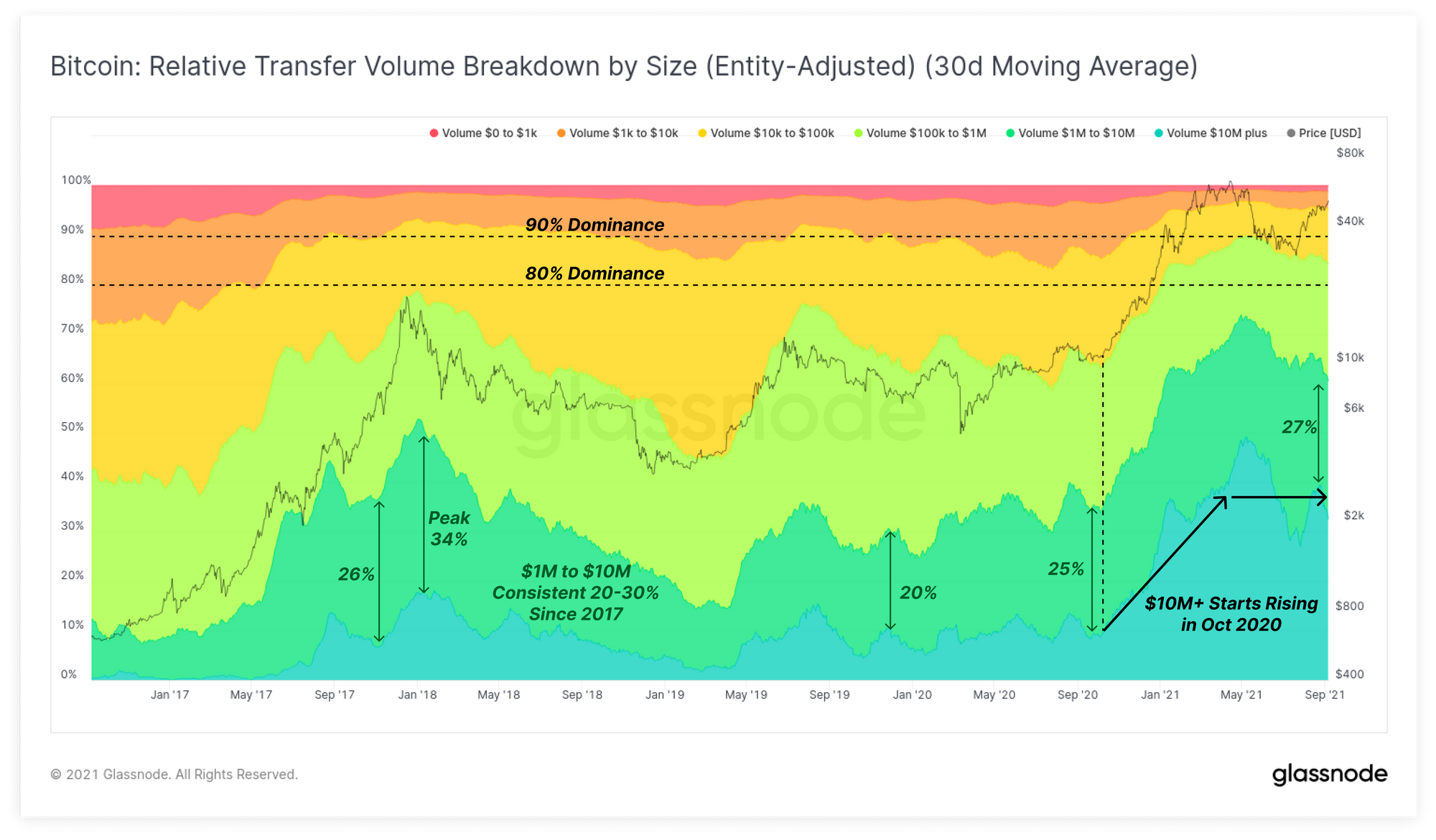 Further support for this observation is found the rising proportion of transaction volume dominance by $100k+ sizes. In the chart below, we can see the gradual squeezing of smaller size capital (<$100k) in yellow-red from 40% dominance in 2017, to represent only 10% to 20% of on-chain volumes today.