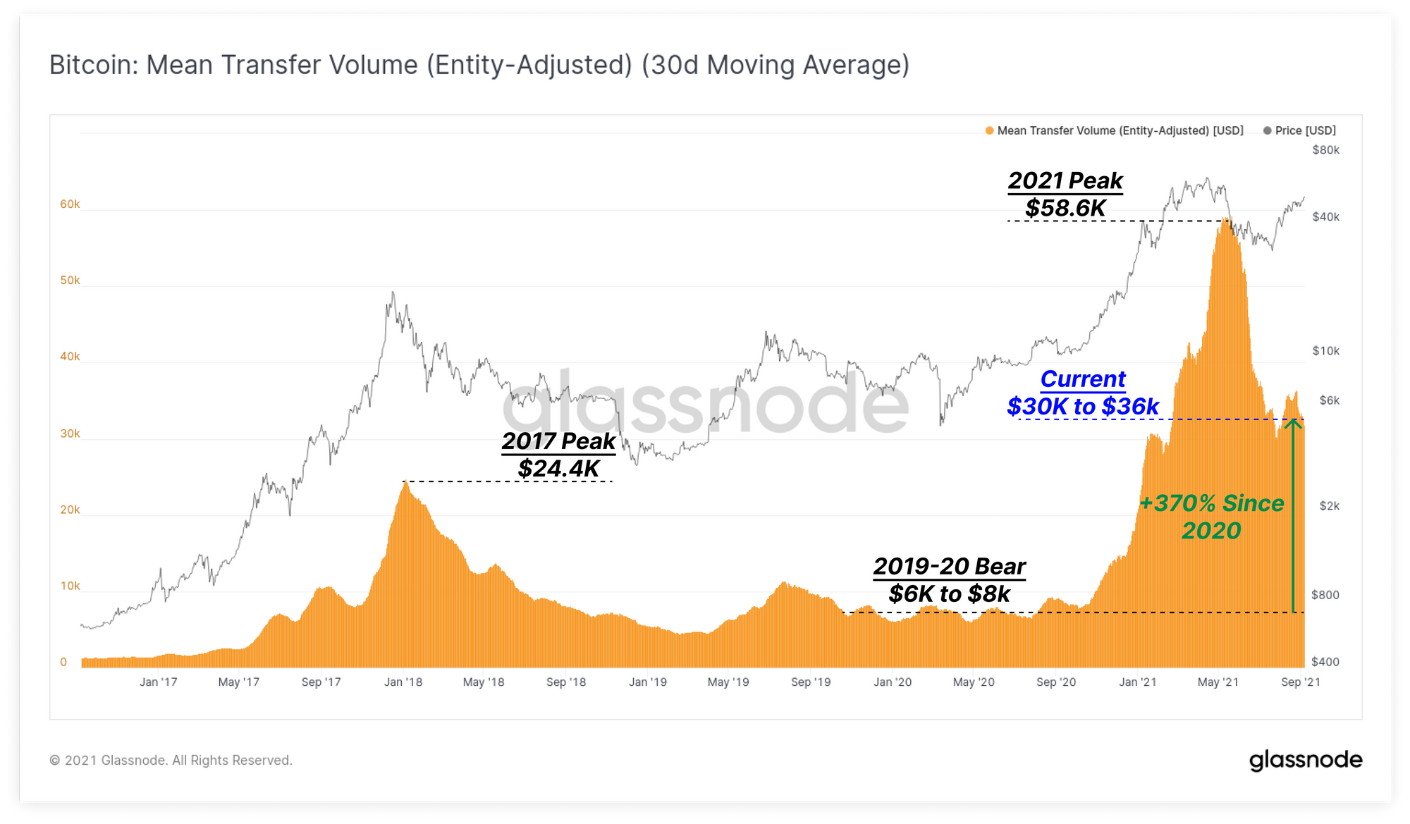 The 2020-21 bull market saw average transaction sizes increase significantly into a peak of $58.6k during the May sell-off. This has largely cooled off from July onwards, with the current average transaction size between $30k and $36k.