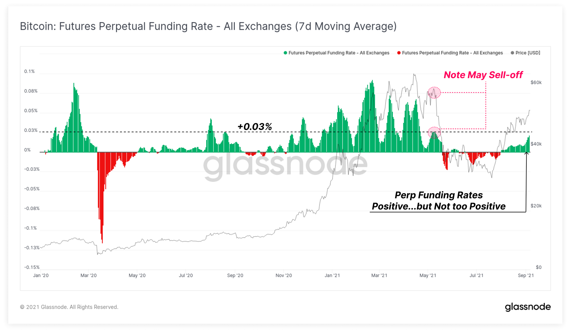 Whilst the supply dynamics in spot markets continue to show strength, caution and awareness is appropriate when of high degrees of leverage has entered derivatives markets. The combination of positive funding rates and high open interest can be an important indicator set for assessing a shorter term risk of cascading long liquidations.