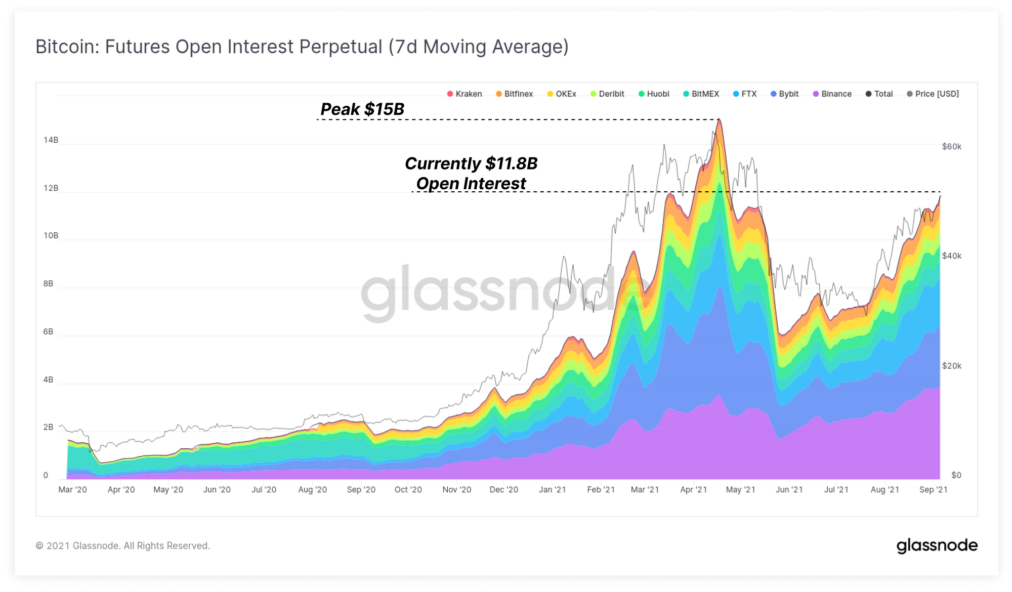 Bitcoin perpetual futures markets currently have over $11.8B in open contracts which is trending strongly towards the April peak of $15B.