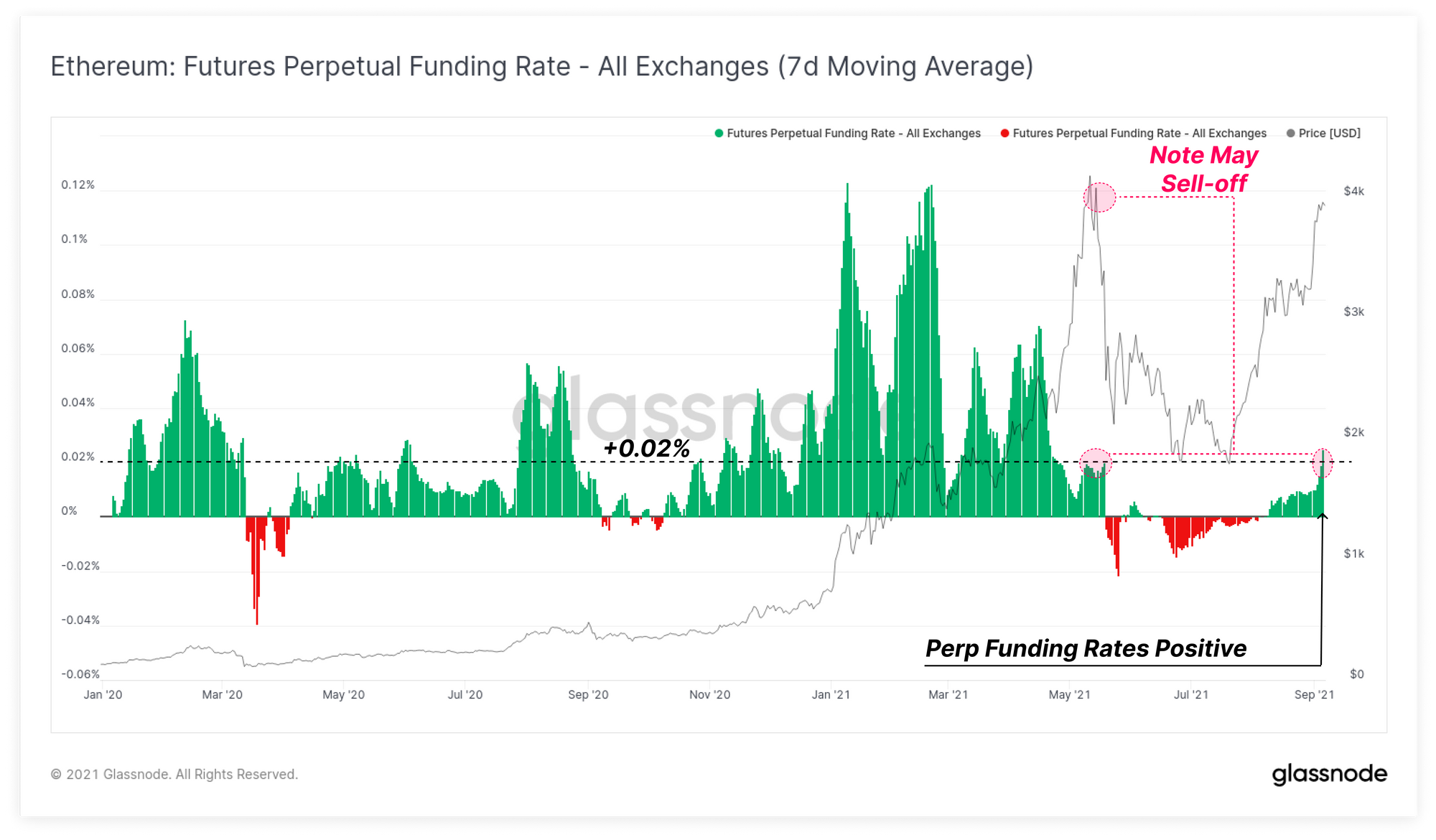 Funding rates for ETH futures have similarly accelerated higher, reaching 0.02%, a level coincident with that seen prior to the May sell-off.