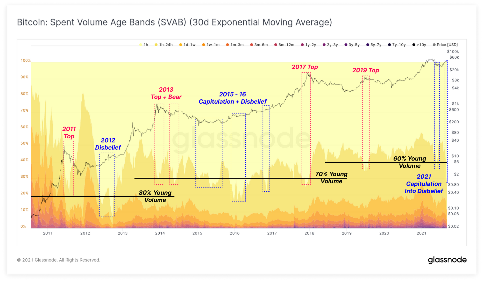 From a macro view we can see that hot/young coin volumes spike and dominate on-chain volumes in three typical occasions: