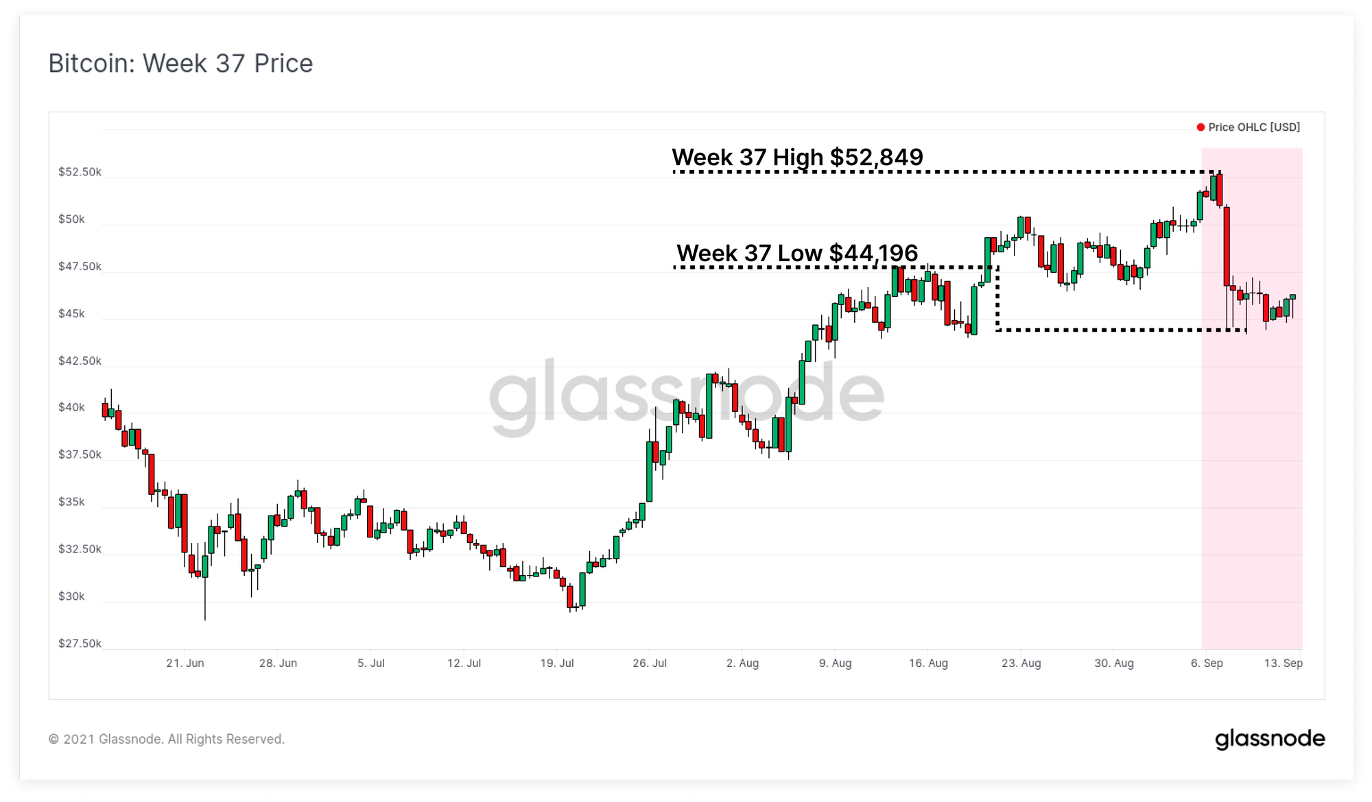 The Bitcoin market experienced a high volatility sell-off early in the week, with prices initially breaking up to a new local high of $52,849, before selling down to a low of $44,196. What appeared to be the main driver on the sell-side, was a flushing out of excessive leverage in futures markets.