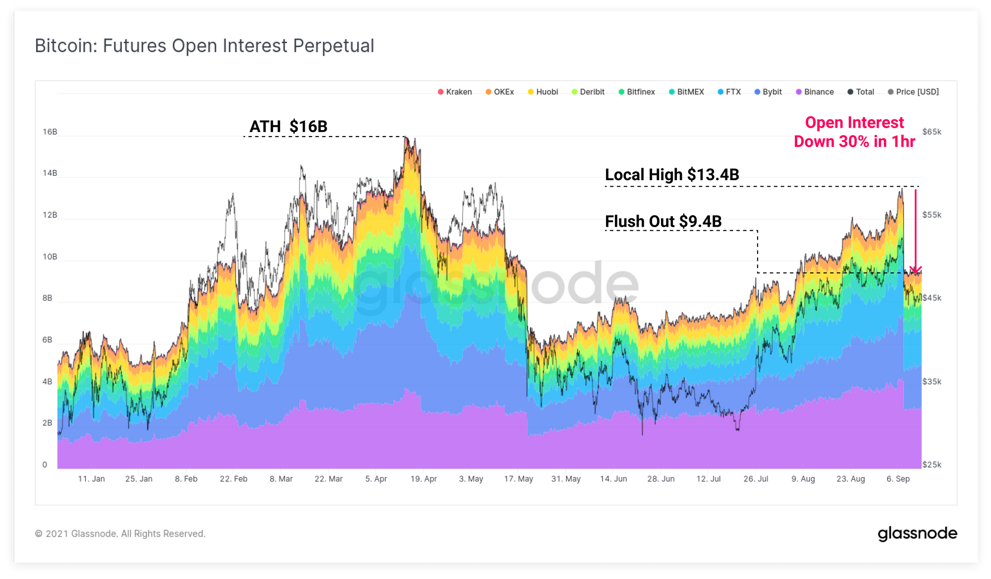 From the local high of $13.4B in open perpetual futures interest, a total of $4B worth of contracts (30%) were closed out and cleared within the hour. Leverage has remained fairly steady at around $9.4B for the remainder of the week.