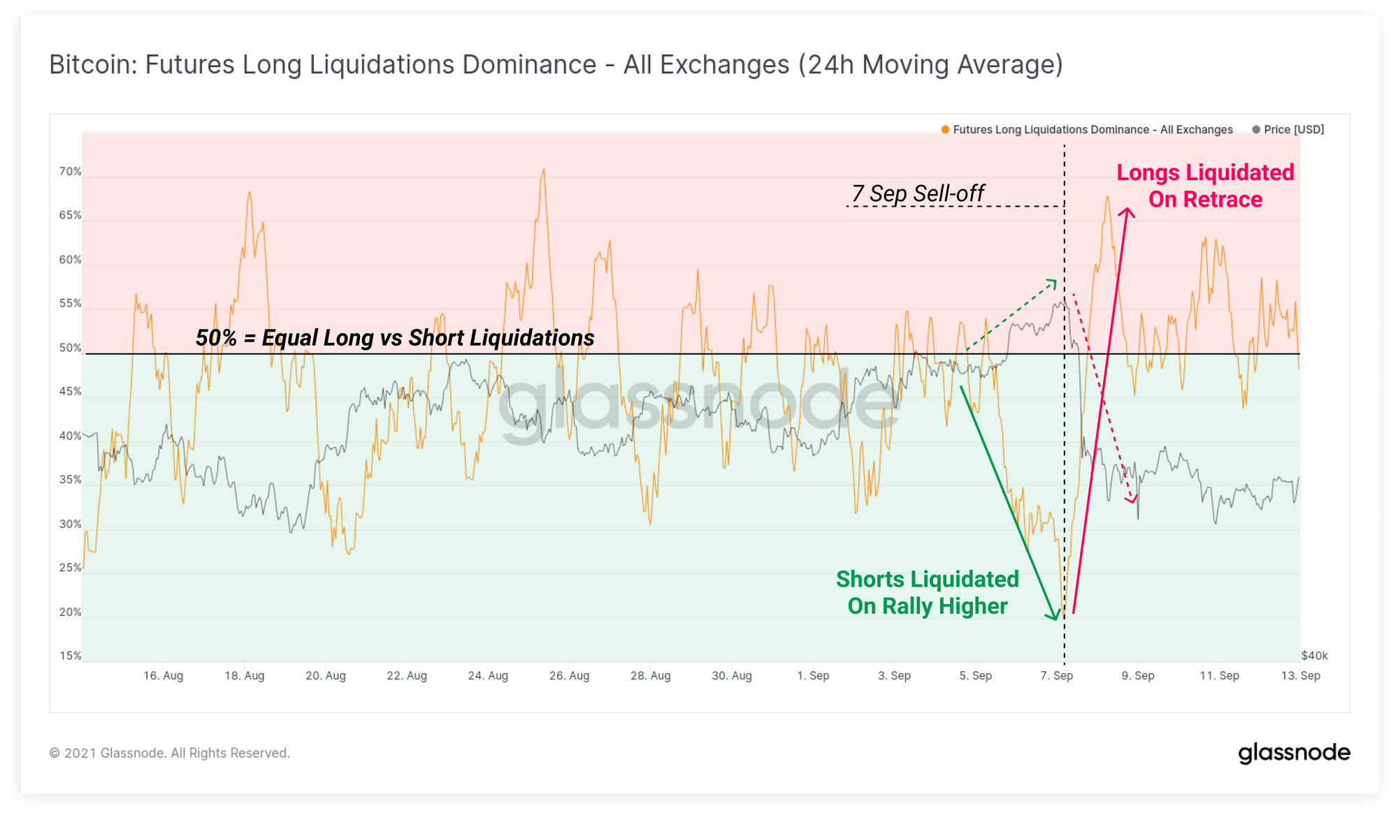 Immediately following this peak, the opposite occurred, with the proportion of long contract liquidations spiking to 68%, as BTC prices fell over $10k from the highs.
