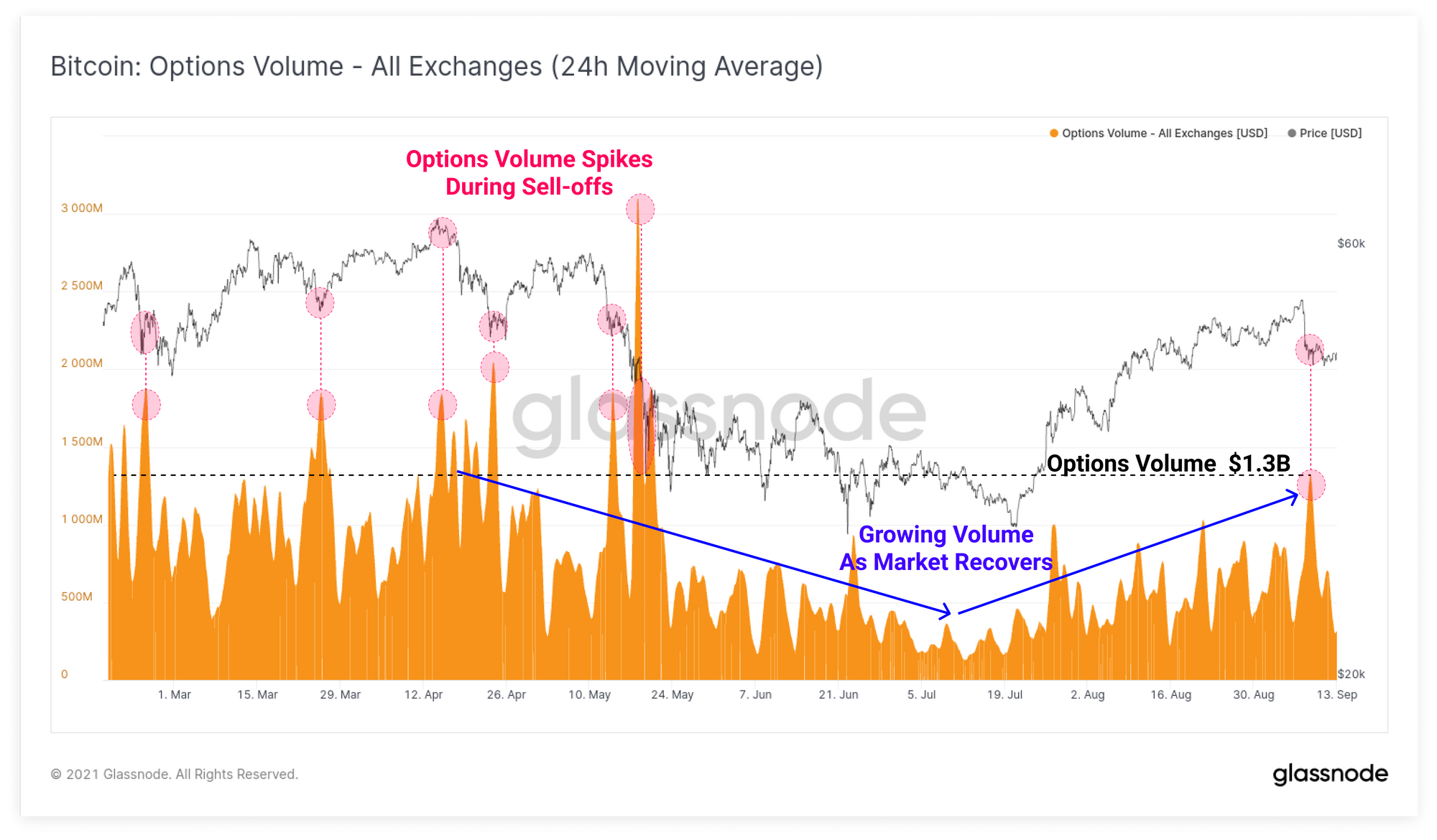 The total volume traded in options markets has been in recovery mode since a relative lull in activity through May to July. During the hours around Tuesday's sell-off, traded option volumes reached a multi-month high of $1.3B.