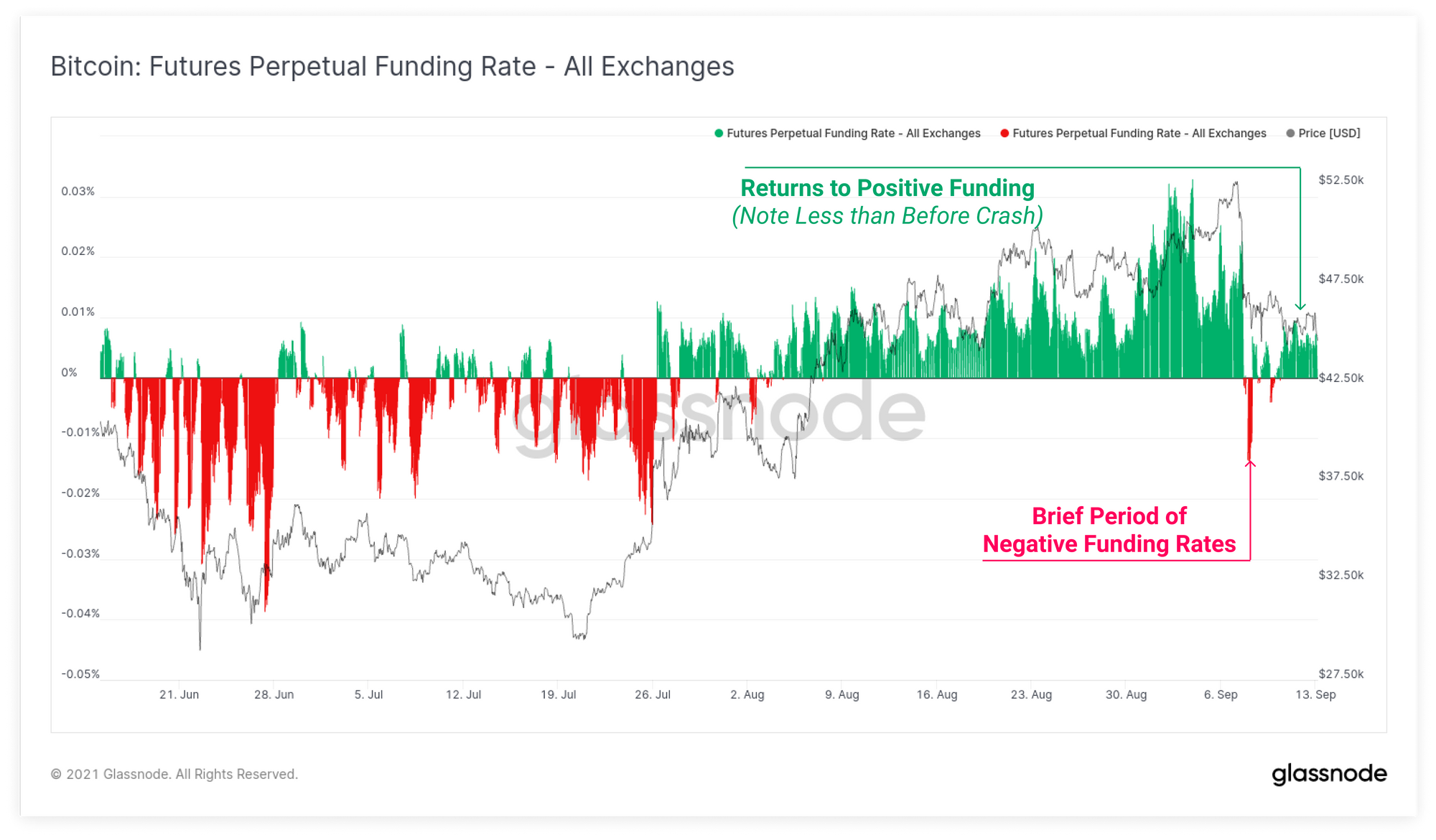 After a very brief period of negative funding rates during the sell-off, perpetual markets have returned to slightly positive funding rate suggesting that traders are still expecting upside price momentum. Note however that the magnitude of funding is much lower than it was prior to the crash, suggesting that at least a partial deleveraging has occurred.