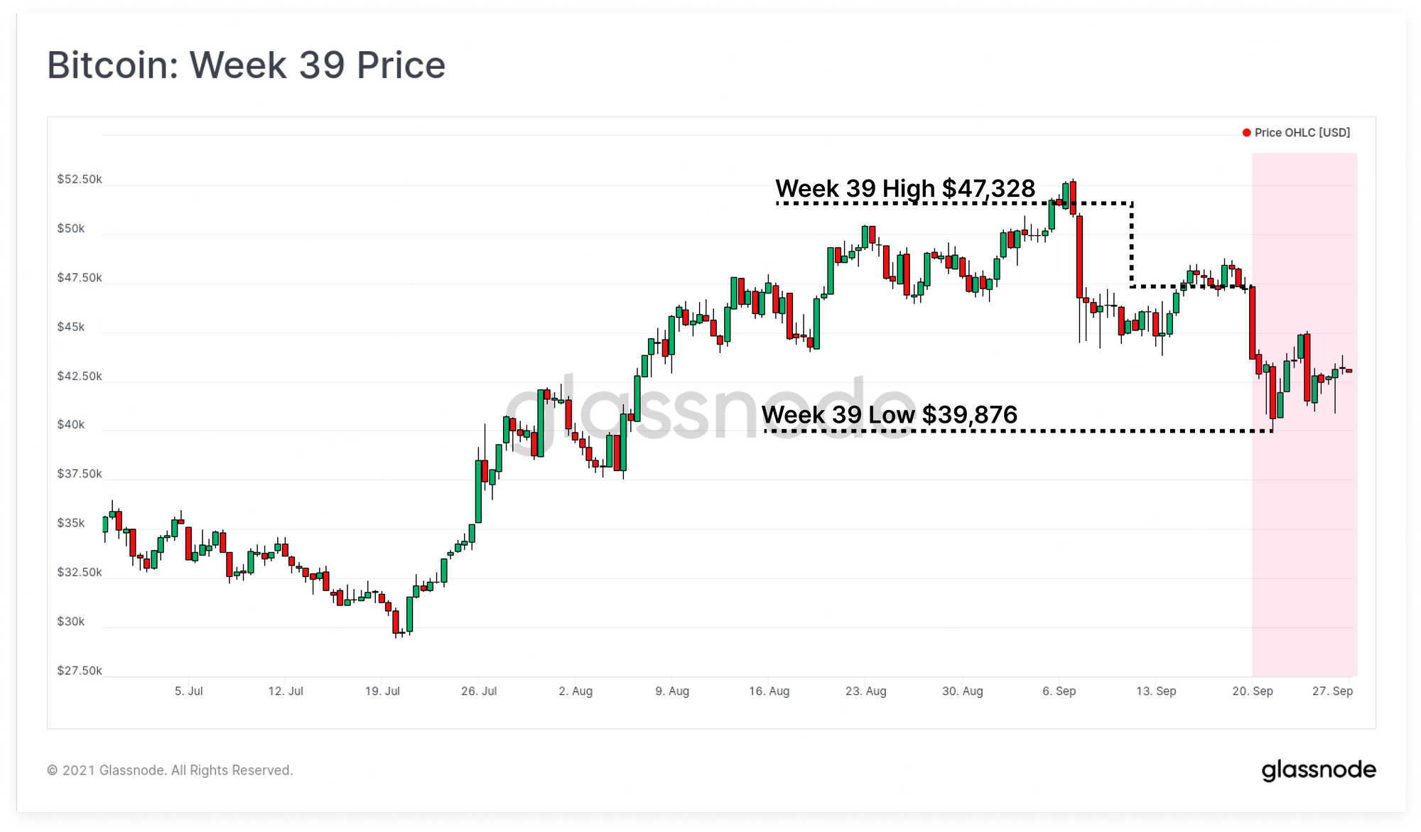 The Bitcoin market experienced volatile downside price action this week, opening at $47,328 on Monday and sliding to a low of $39,876. The sell-off comes alongside continued pressure on the industry from regulators, a sell-off in equities markets, challenging conditions in Chinese debt markets, and yet another Bitcoin ban in China.