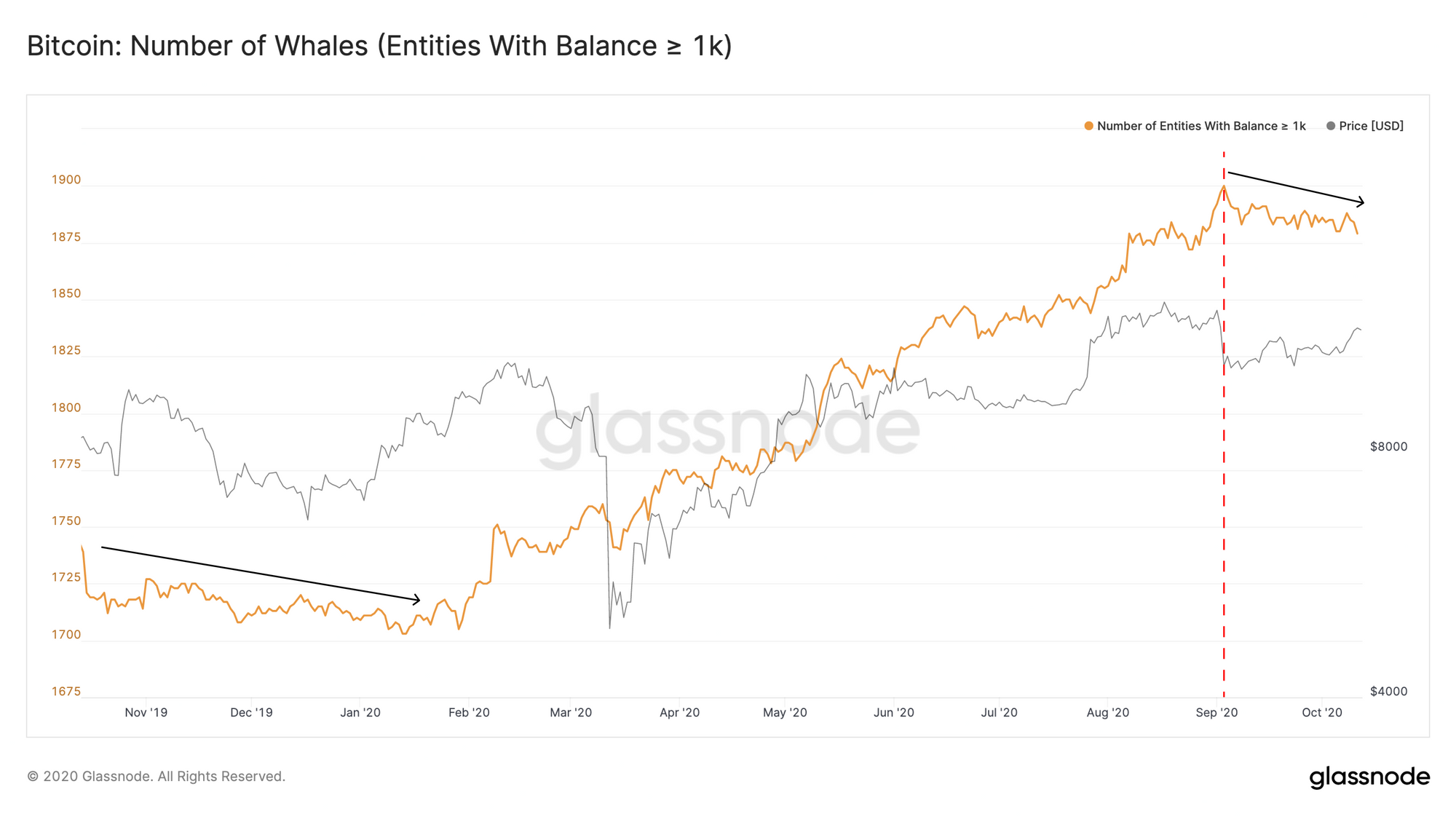 Throughout 2020, the number of BTC whales (entities holding at least 1000 BTC) has been growing consistently, showing trends similar to 2012 and 2014-15. However, since early September, the number of whales has actually started decreasing - the first decline since late 2019.