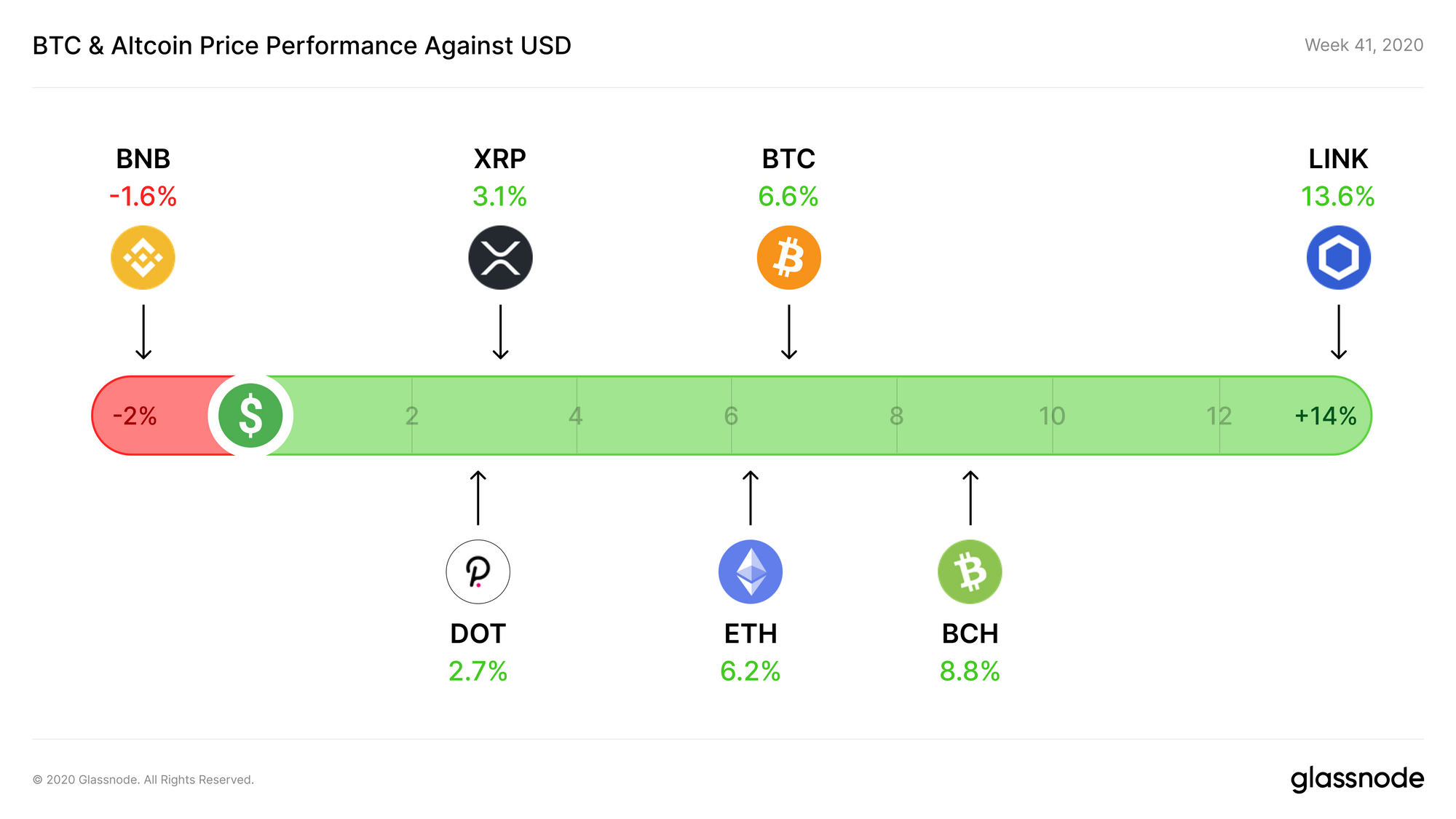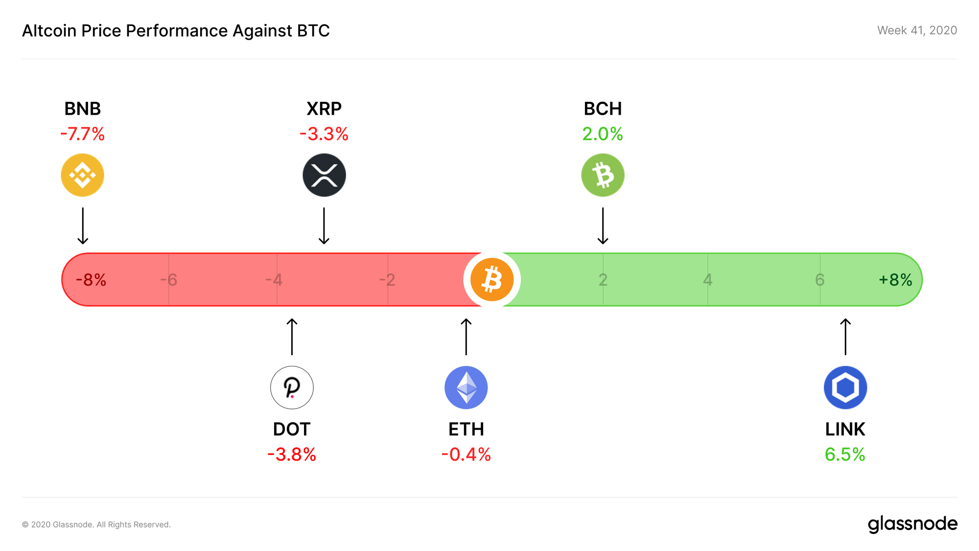 The top altcoins saw mixed performance against BTC for Week 41. As is a common pattern, blockchain protocol coins (such as ETH and BCH) experienced less variation, while utility tokens (such as BNB and LINK) fluctuated more widely.