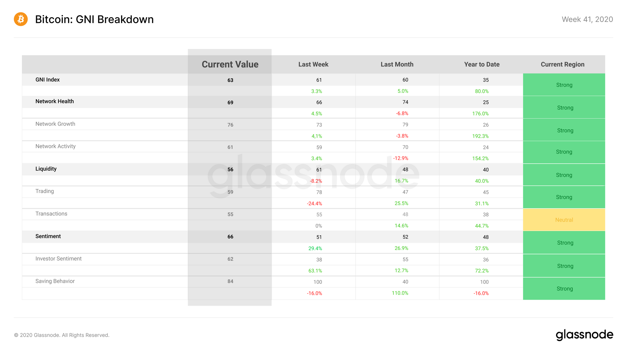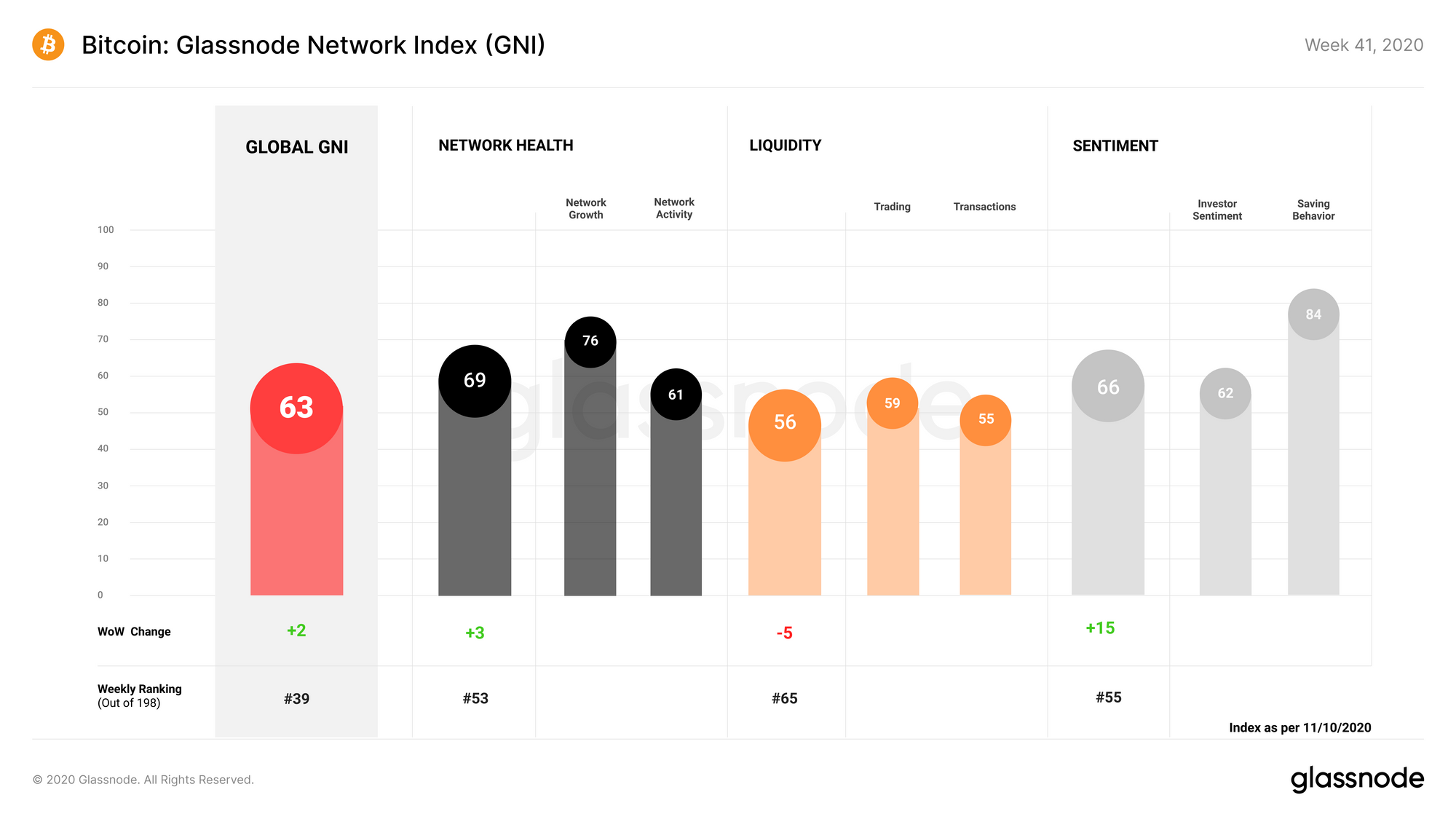 Bitcoin on-chain fundamentals grew slightly over Week 41. GNI gained 2 points, climbing up to a score of 63. This was mostly due to a rise in the Sentiment subindex, which grew significantly, gaining 15 points from the previous week. Meanwhile, Liquidity decreased, preventing GNI from growing even higher.