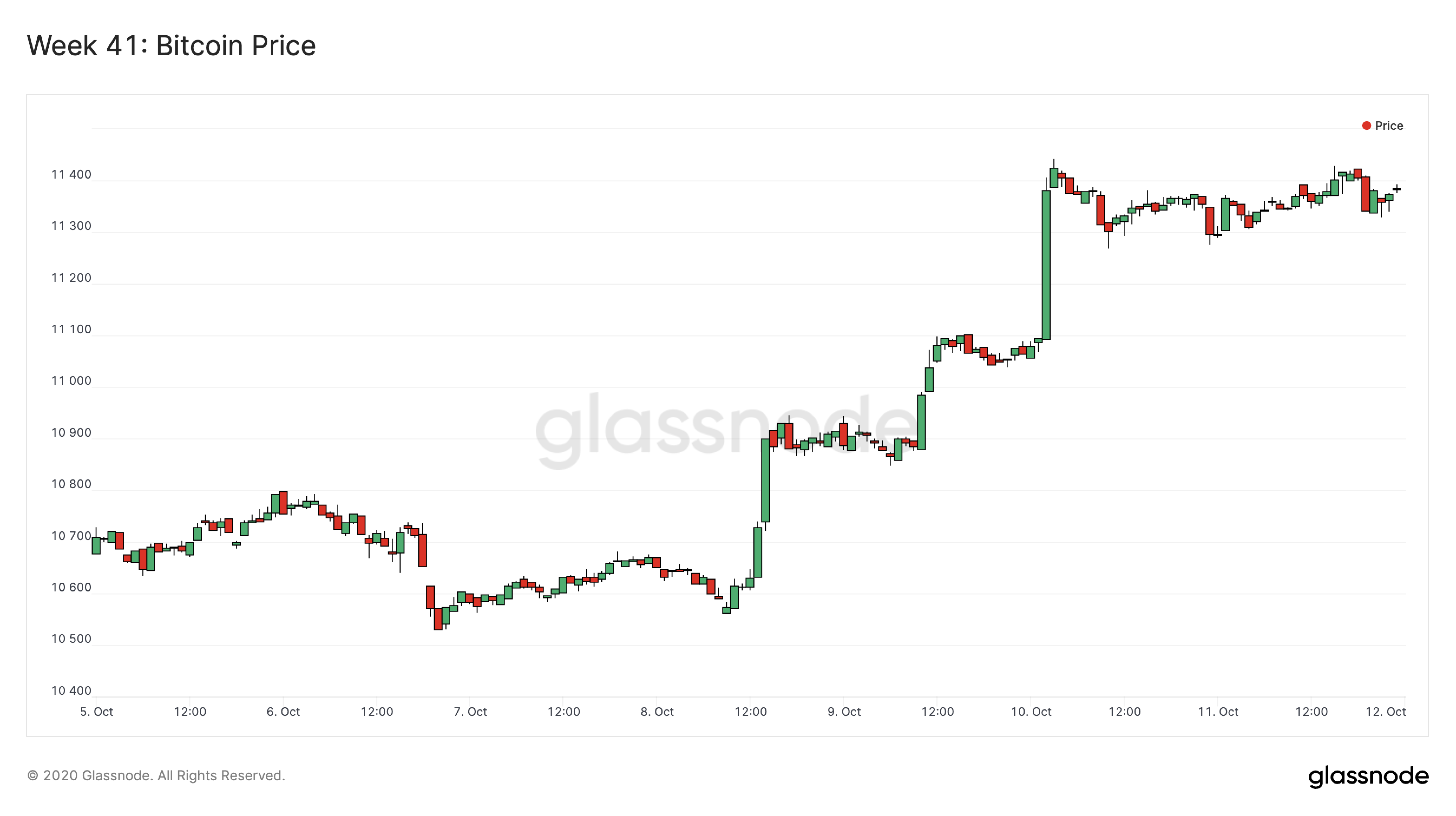 Bitcoin saw decent price gains over Week 41, starting the week at $10,650 and ending it 6.6% up, at $11,360. After seeing growth on Thursday and Saturday, BTC found stable support above $11k for the first time since August.