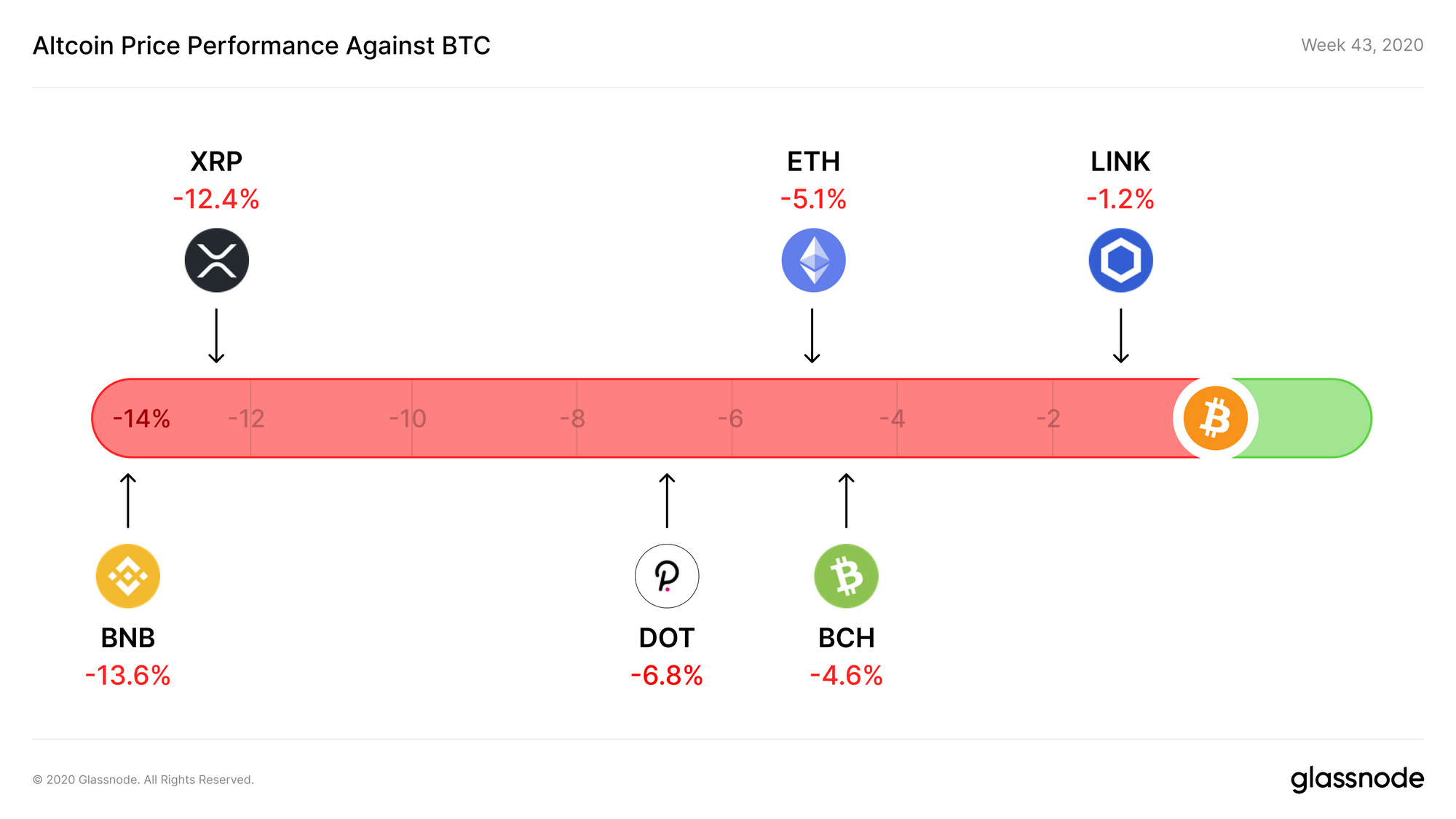 BNB lost 1.7% of its USD value over Week 43. Meanwhile, all other top 10 altcoins saw price gains, despite underperforming against BTC.
