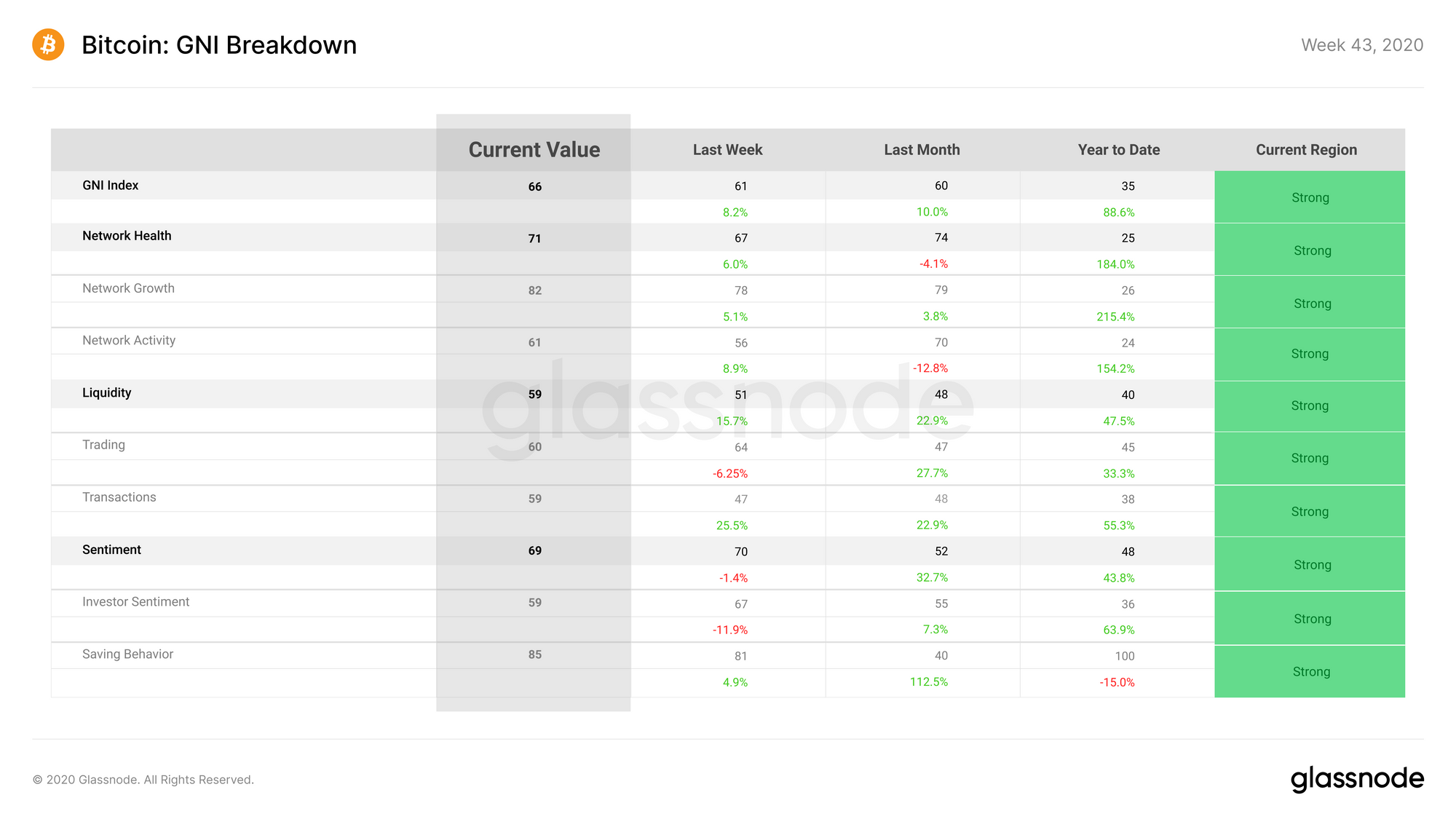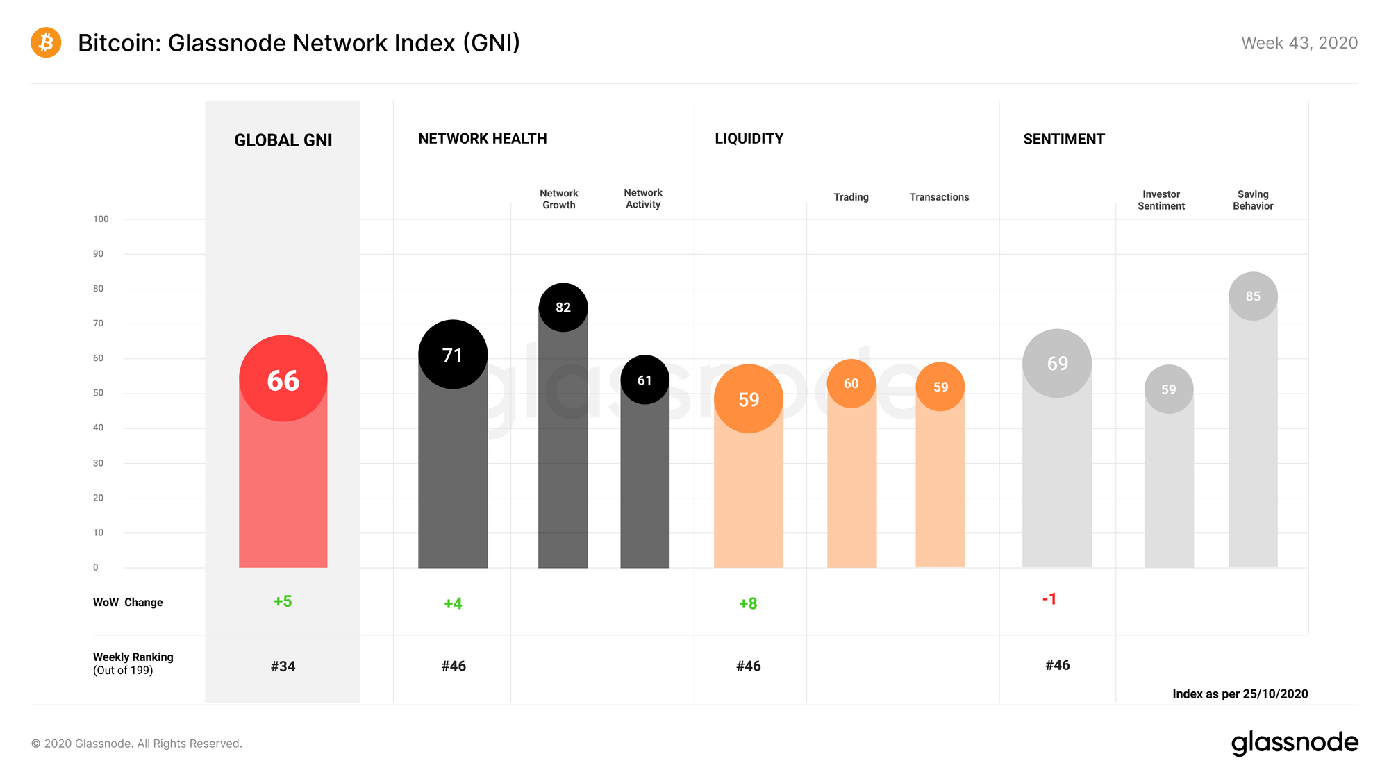 Bitcoin on-chain fundamentals increased alongside the price of BTC throughout Week 43. GNI gained 5 points, rising to a score of 66 points from 61 the previous week. This increase was due to gains in the Network Health and Liquidity subindices, while Sentiment dropped slightly.