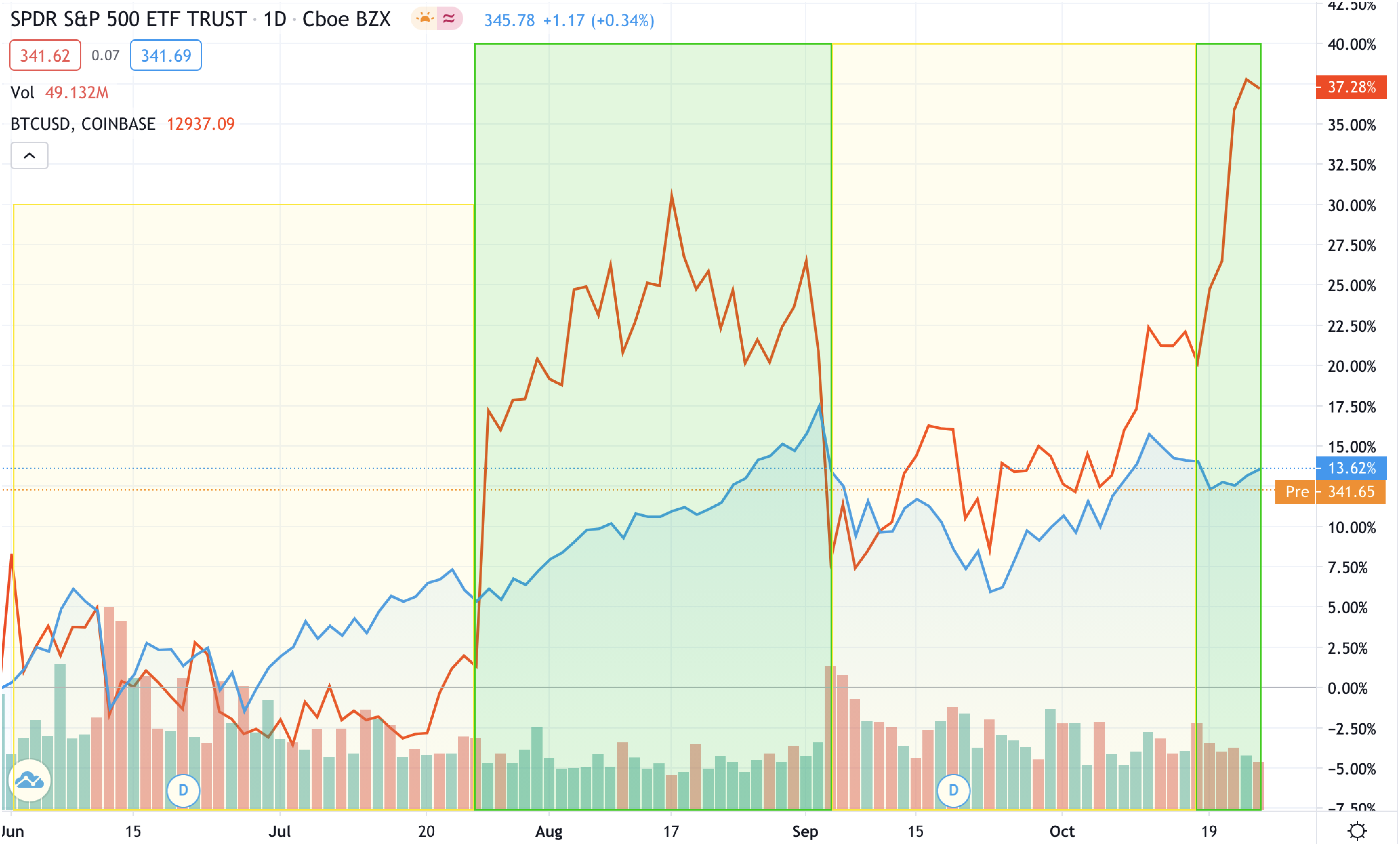 The past week's price increase coincided with an increase in stock prices, but whereas stocks have increased by only a small amount, the price of BTC spiked significantly. This represents bitcoin's largest deviation from the stock market since July this year.