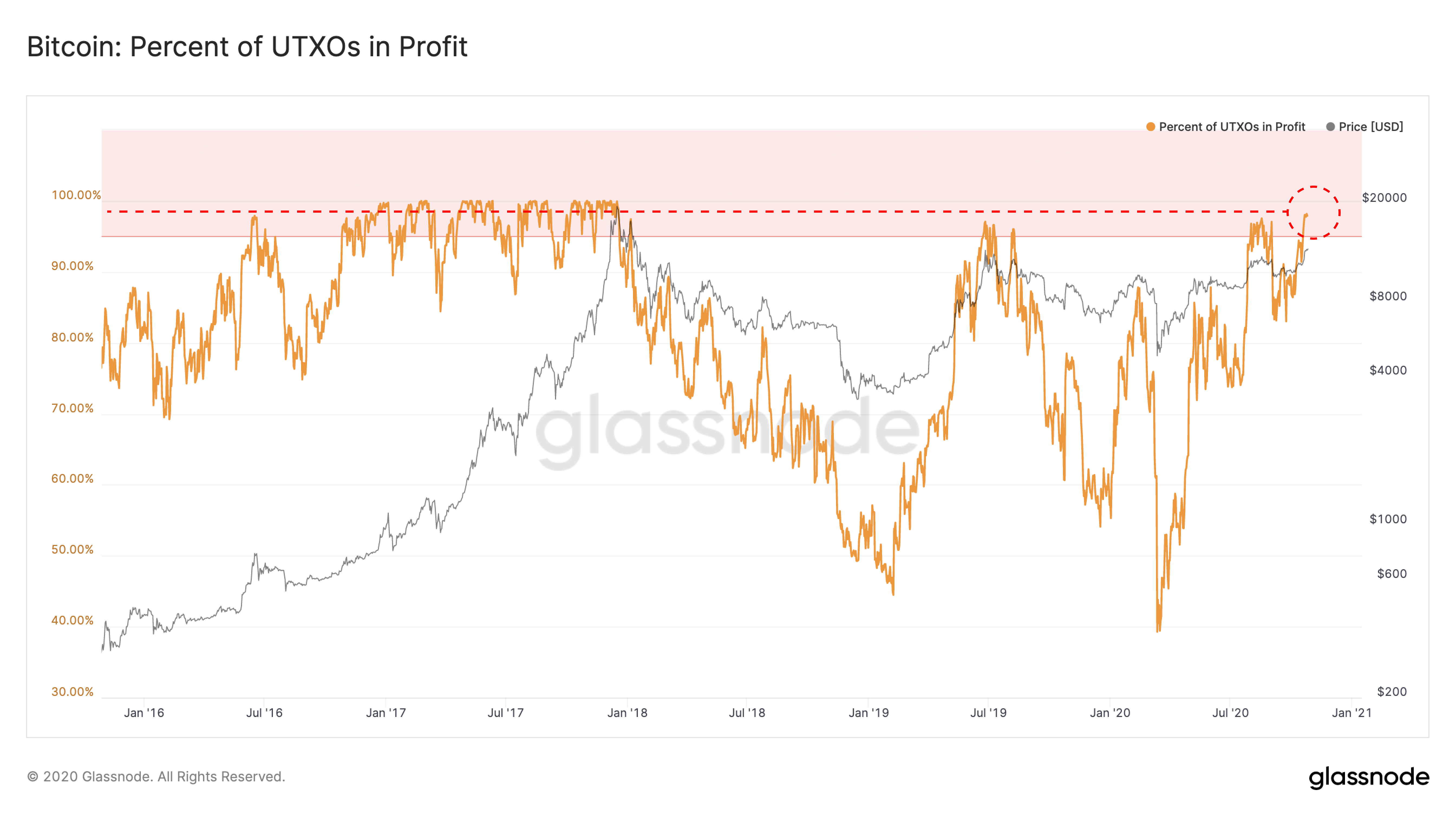 With bitcoin's latest run up to over $13,000, the portion of UTXOs in profit now stands at 98% - a value not seen since December 2017. This high value, typically seen during BTC bull runs, means that almost all UTXOs were created when the price was lower than it is currently.