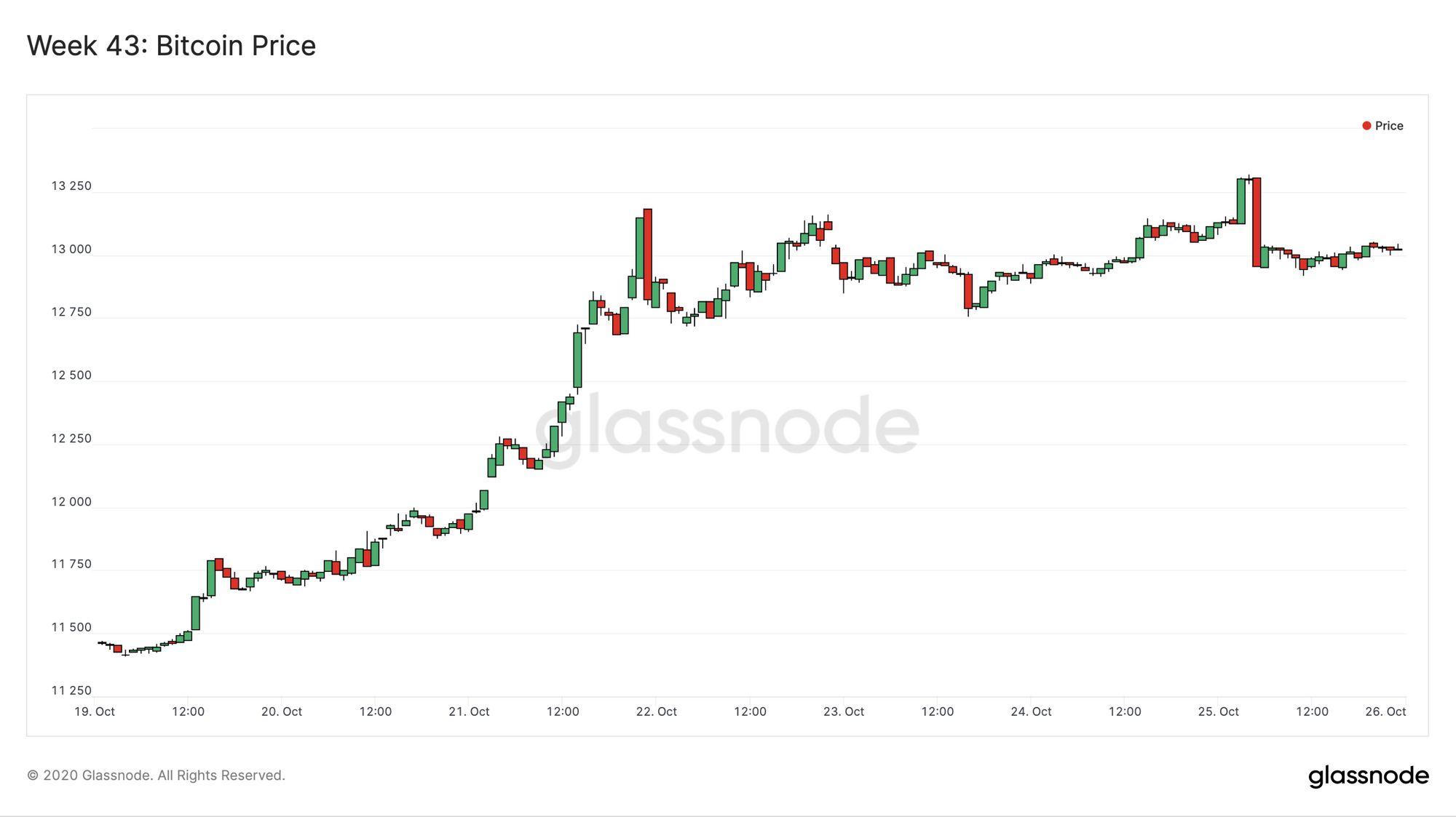 Bitcoin gained an impressive 13.7% over Week 43, starting the week at $11,450 and ending it at $13,020. After rising above $13k on Wednesday evening, BTC managed to retain support at this level, occasionally slipping down into the $12,000s but quickly rising back up.