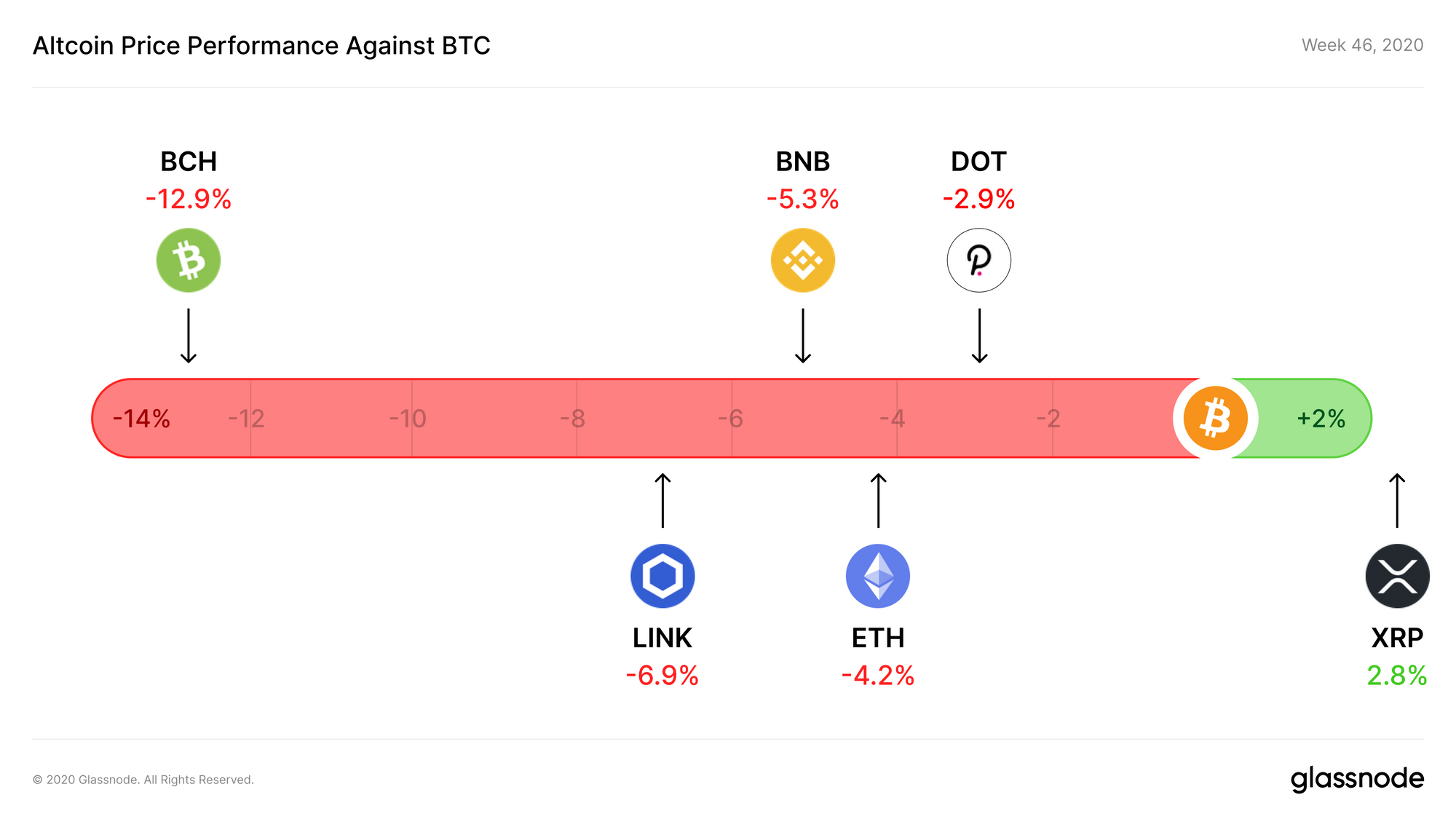 The top altcoins mostly performed poorly in comparison with bitcoin throughout Week 46, with the exception of XRP, which gained 2.8% against BTC.