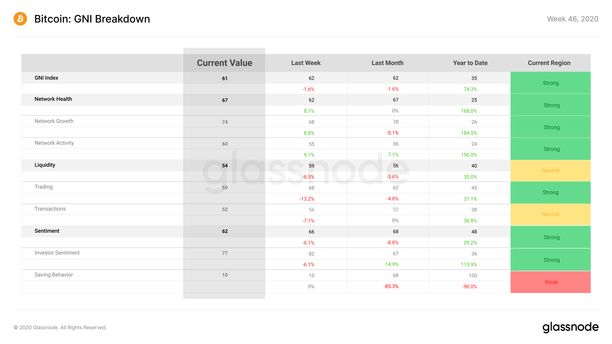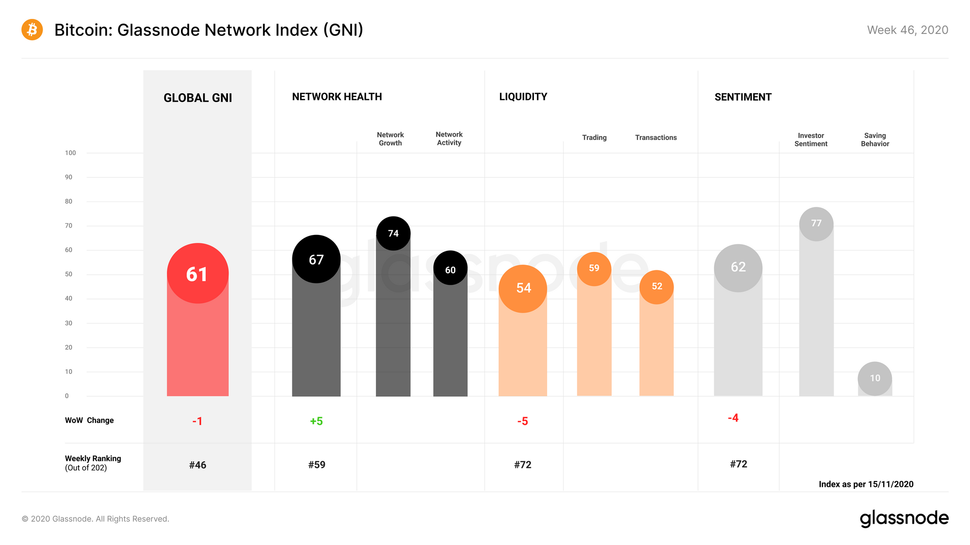 Bitcoin on-chain fundamentals saw a small drop over Week 46. GNI lost 1 point, dropping to a score of 61 points. This was caused by decreases in the Liquidity and Sentiment subindices, while Network Health increased.